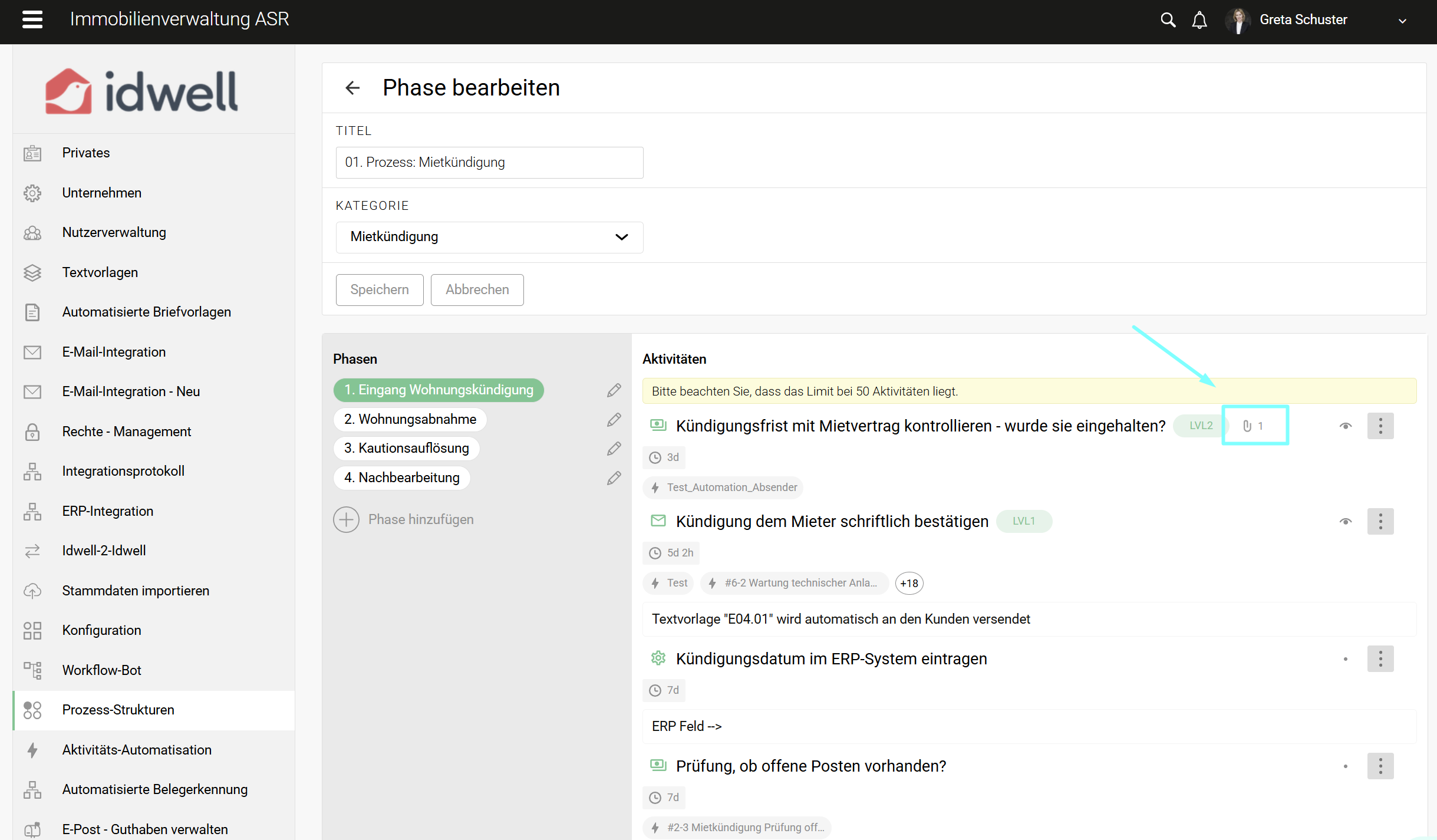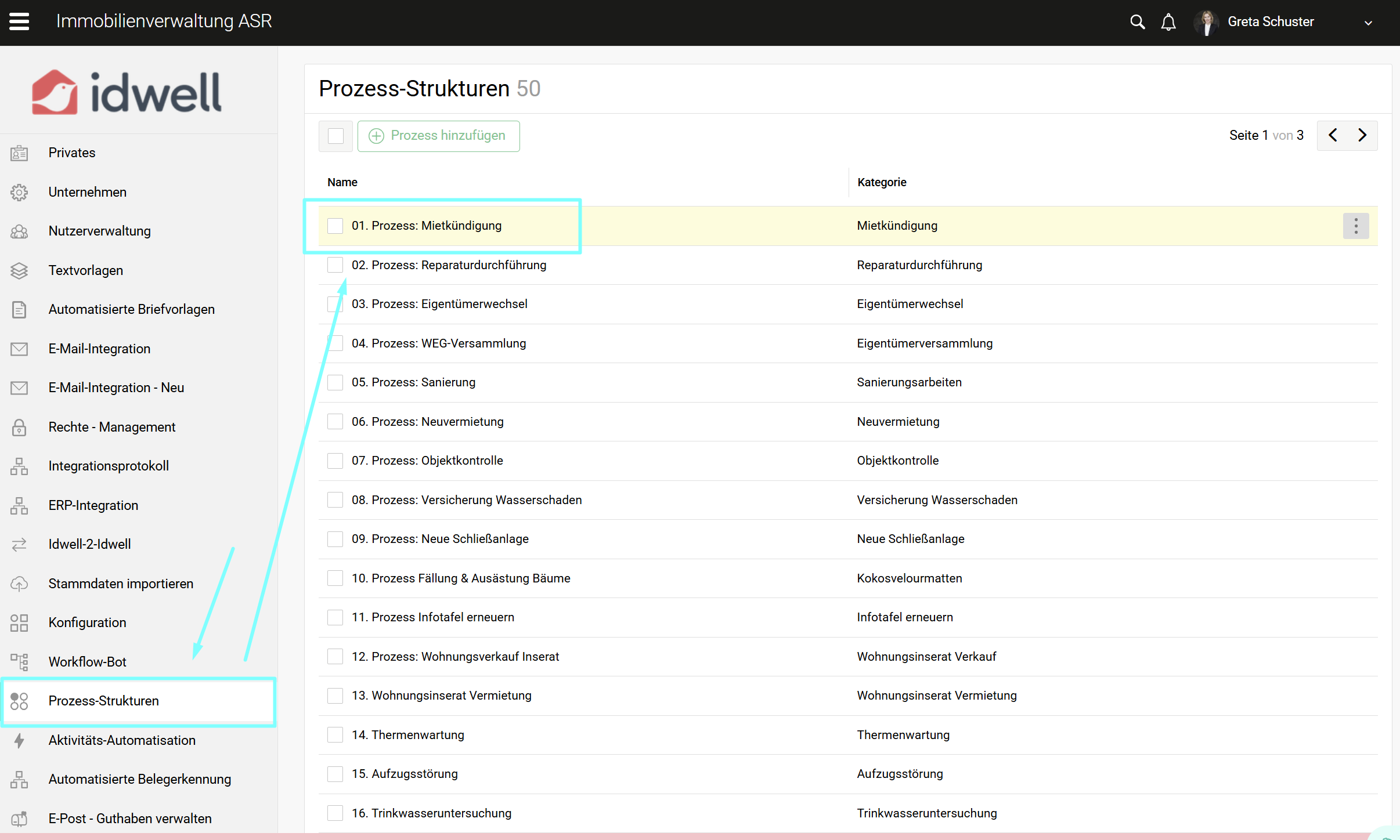 Öffnen Sie den Reiter "Prozess-Strukturen" und rufen Sie den gewünschten Prozess auf (z. B. "Mietkündigung").