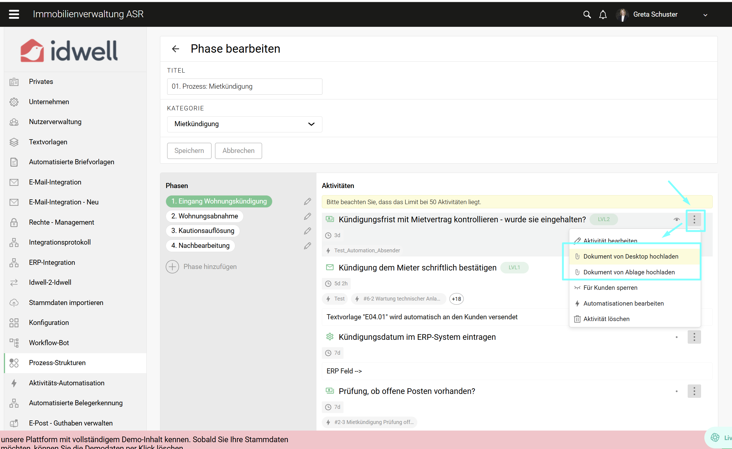 Klicken Sie auf die spezifische Aktivität, in der das Dokument benötigt wird (z. B. "Wohnungsübergabe durchführen"). Klicken Sie innerhalb der Aktivität auf das Drei-Punkte-Menü (Optionen).