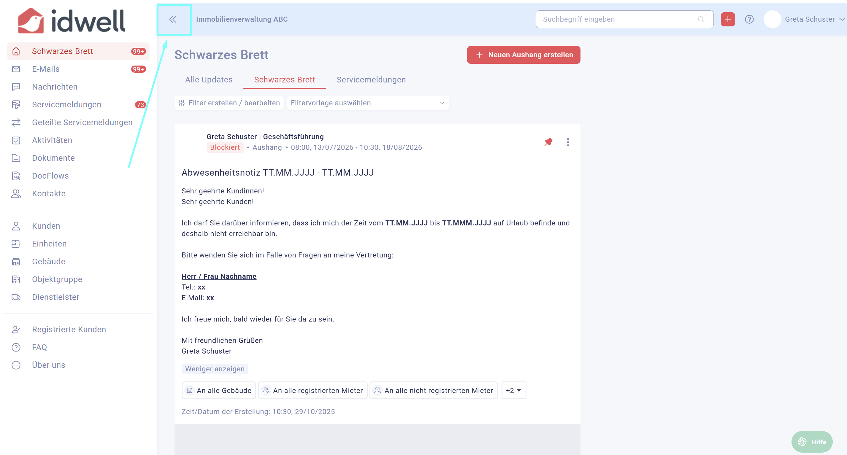 Unser Tipp: Sollten Sie das Portal am Handy oder am iPad aufrufen, so verkleinert sich die Ansicht . Die Linke Menüleiste verrutscht dadurch etwas mehr in die Mitte und kann eventuell Informationen verdecken. Durch einen Klick auf die 3 Balken links oben im Eck können Sie die Menüleiste einklappen.