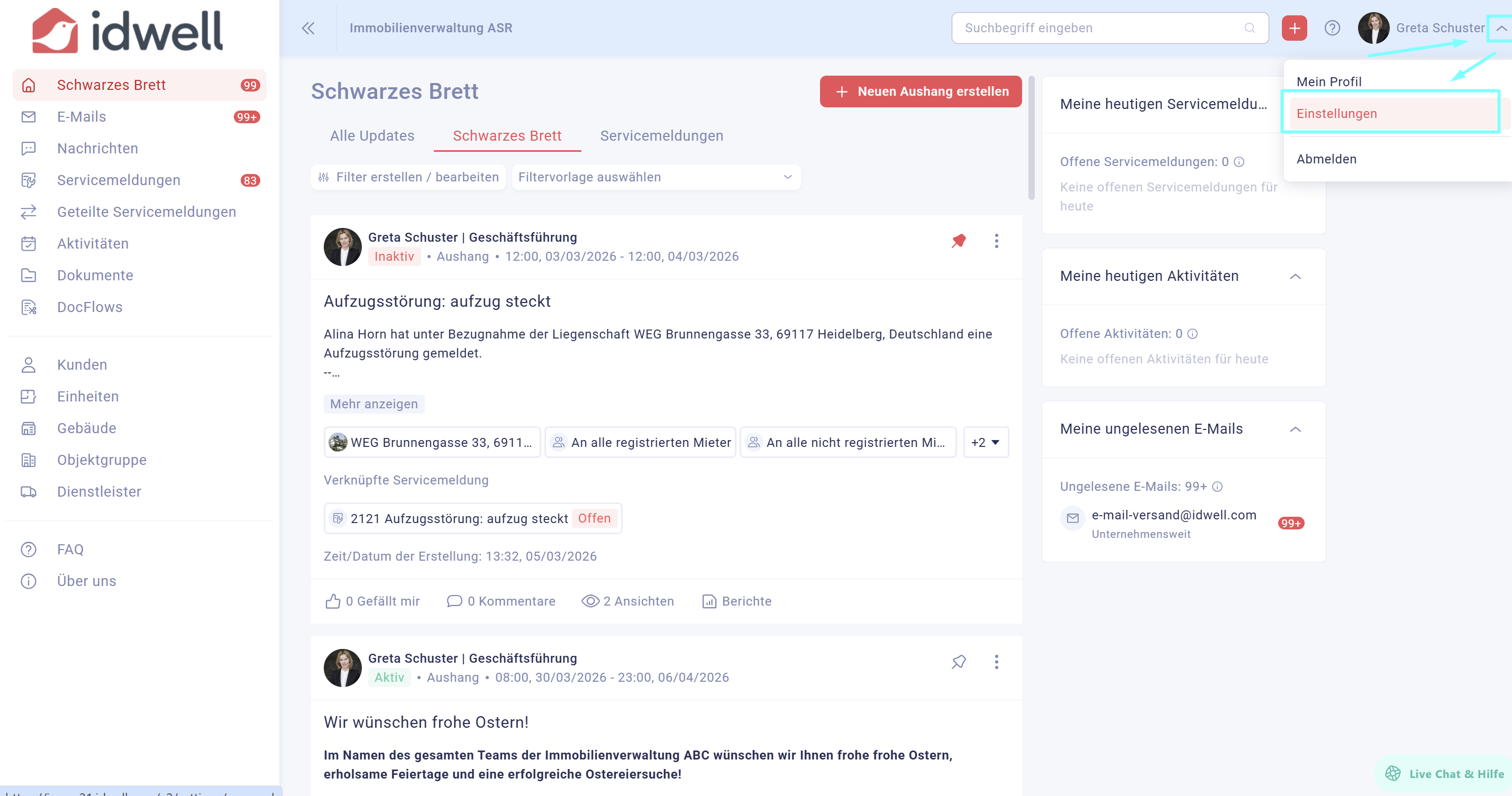 Klicken Sie rechts oben auf der horizontalen Leiste auf Ihren Namen und wählen Sie “Einstellungen” aus.