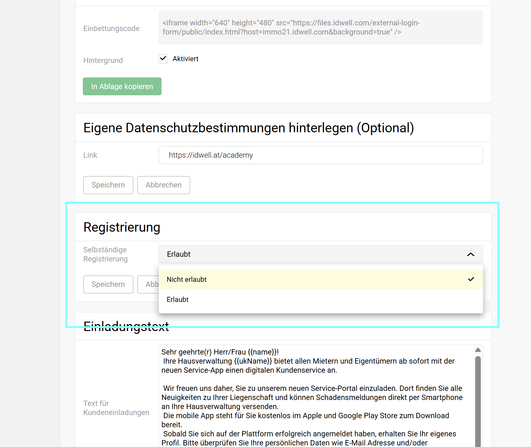 Wählen Sie bei “Registrierung” aus, ob die selbständige Registrierung erlaubt ist.