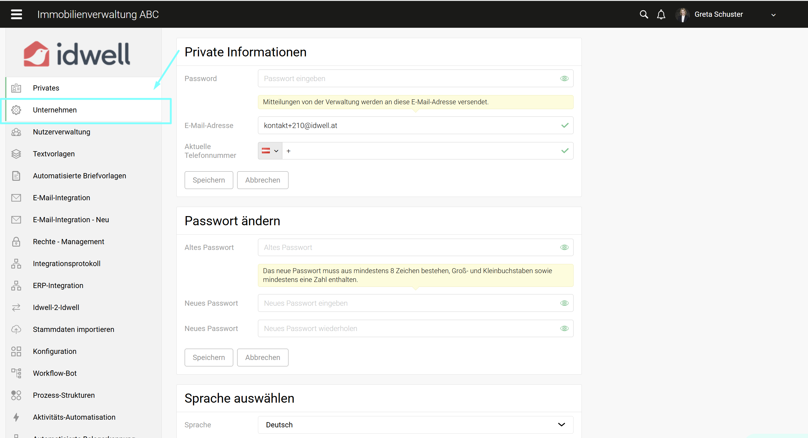 Wählen Sie links die Menüleiste “Unternehmen” aus und scrollen Sie nach unten.