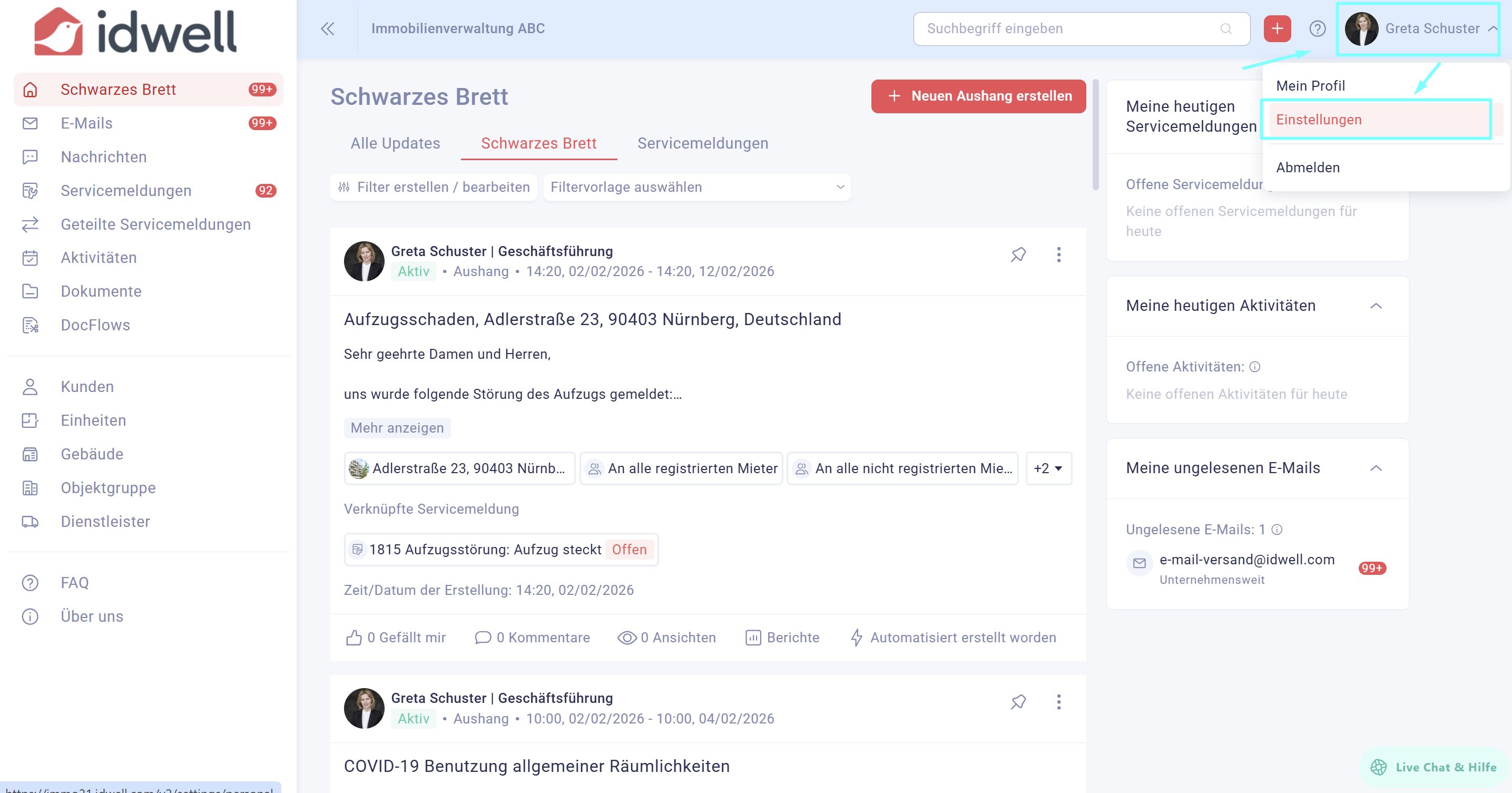 Klicken Sie rechts oben auf der horizontalen Leiste auf Ihren Namen und wählen Sie “Einstellungen” aus.