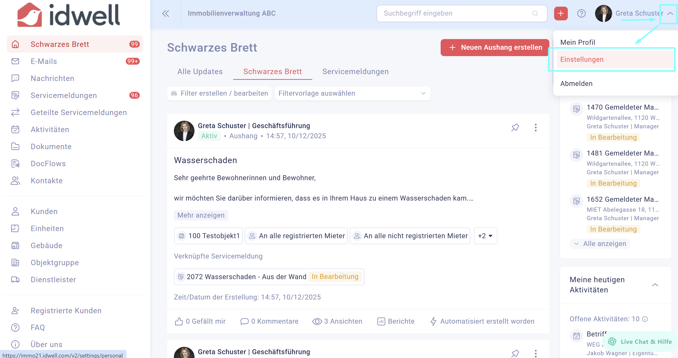Klicken Sie rechts oben auf der horizontalen Leiste auf Ihren Namen und wählen Sie “Einstellungen” aus.