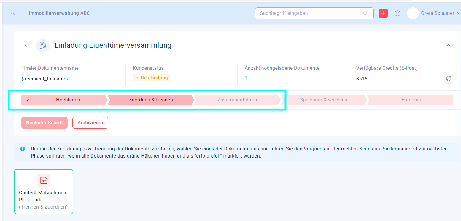 Im nachfolgenden Tutorial erfahren Sie, wie Sie Dokumente hochladen, teilen, zuordnen und stapeln können - also alle notwendigen Schritte für die Phasen "Hochladen", "Zuordnen & trennen" und "Zusammenführen".