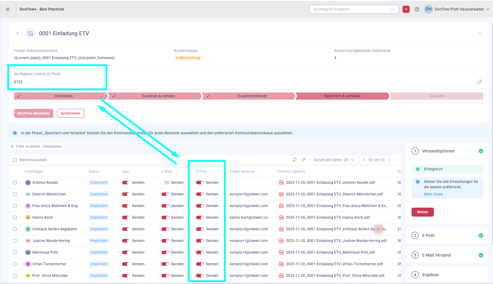 Die E-Post können Sie aktivieren, sobald Sie "Credits" für den Versand bei uns erworben haben. Ob Sie über Credits verfügen, sehen Sie in der Kopfzeile des DocFlows unter "Verfügbare Credits".