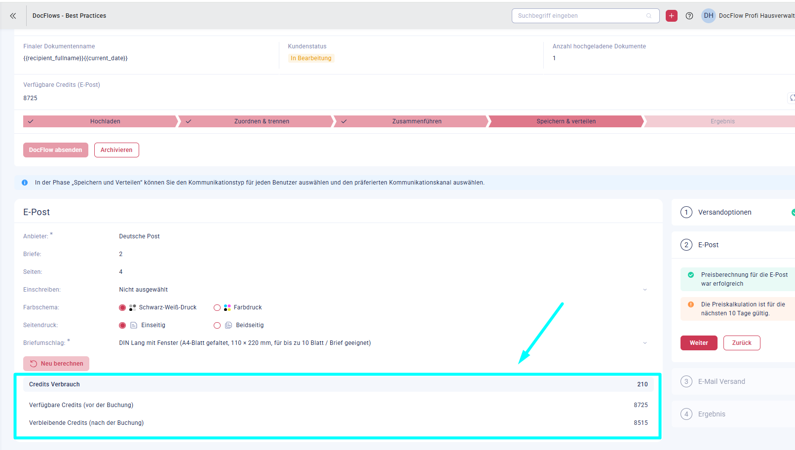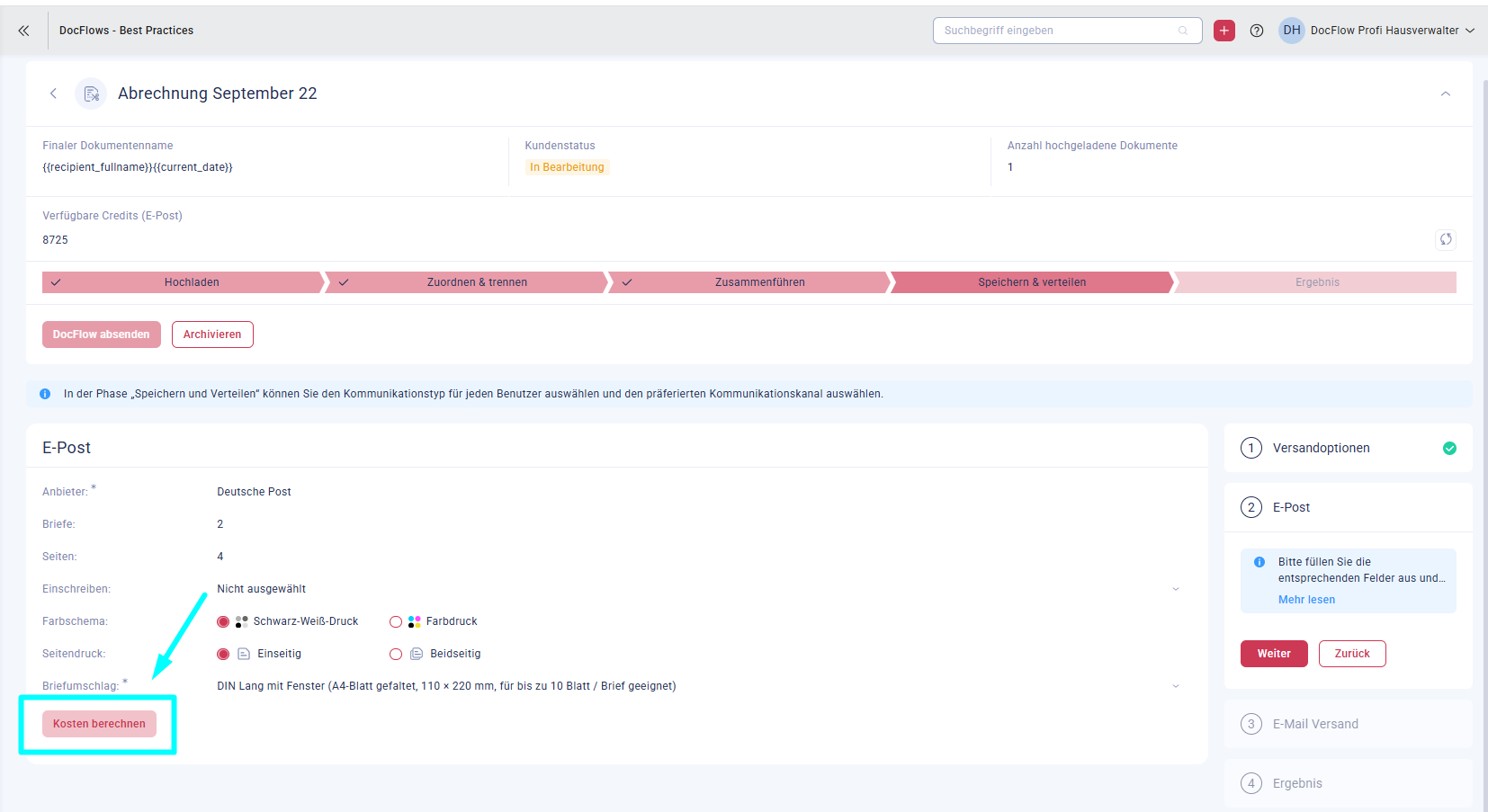 Nach der Auswahl der Einstellungsmöglichkeiten können Sie unter "Kosten berechnen" die benötigten Credits für den E-Post-Versand berechnen.