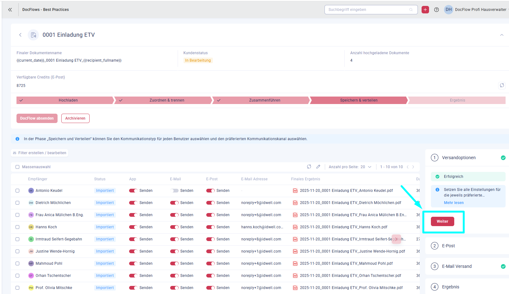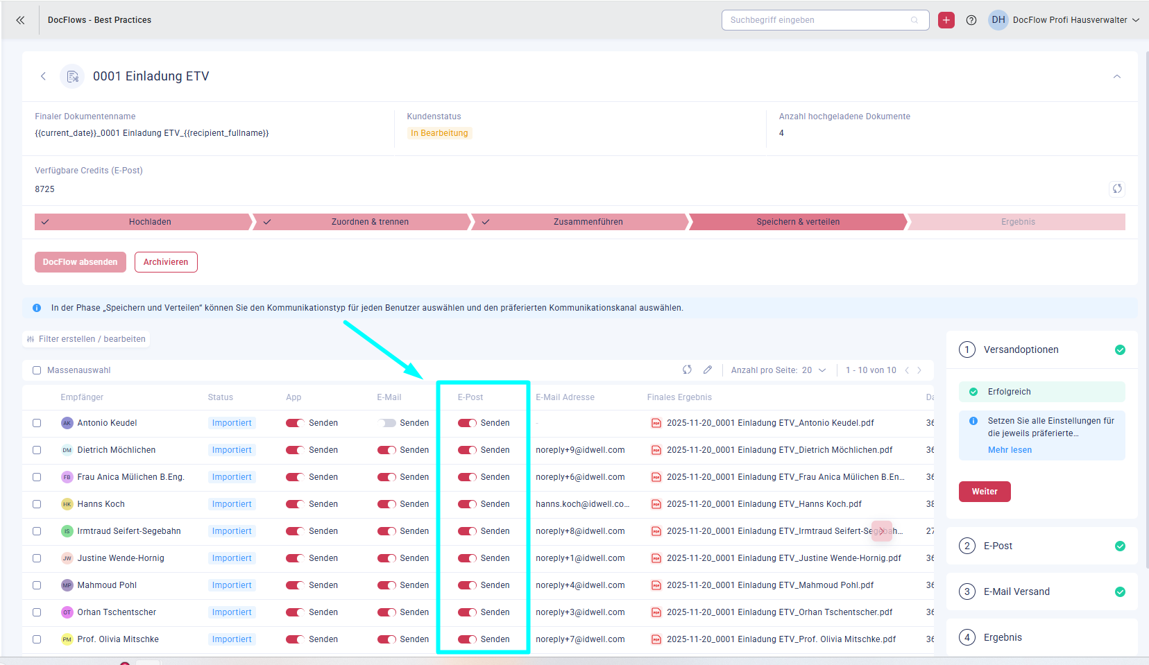 Wenn Sie in der Phase "Speichern & verteilen" angelangt sind, können Sie nun die jeweilige Versandoption für Ihre Empfänger bestimmen - wie unter anderem die "E-Post".