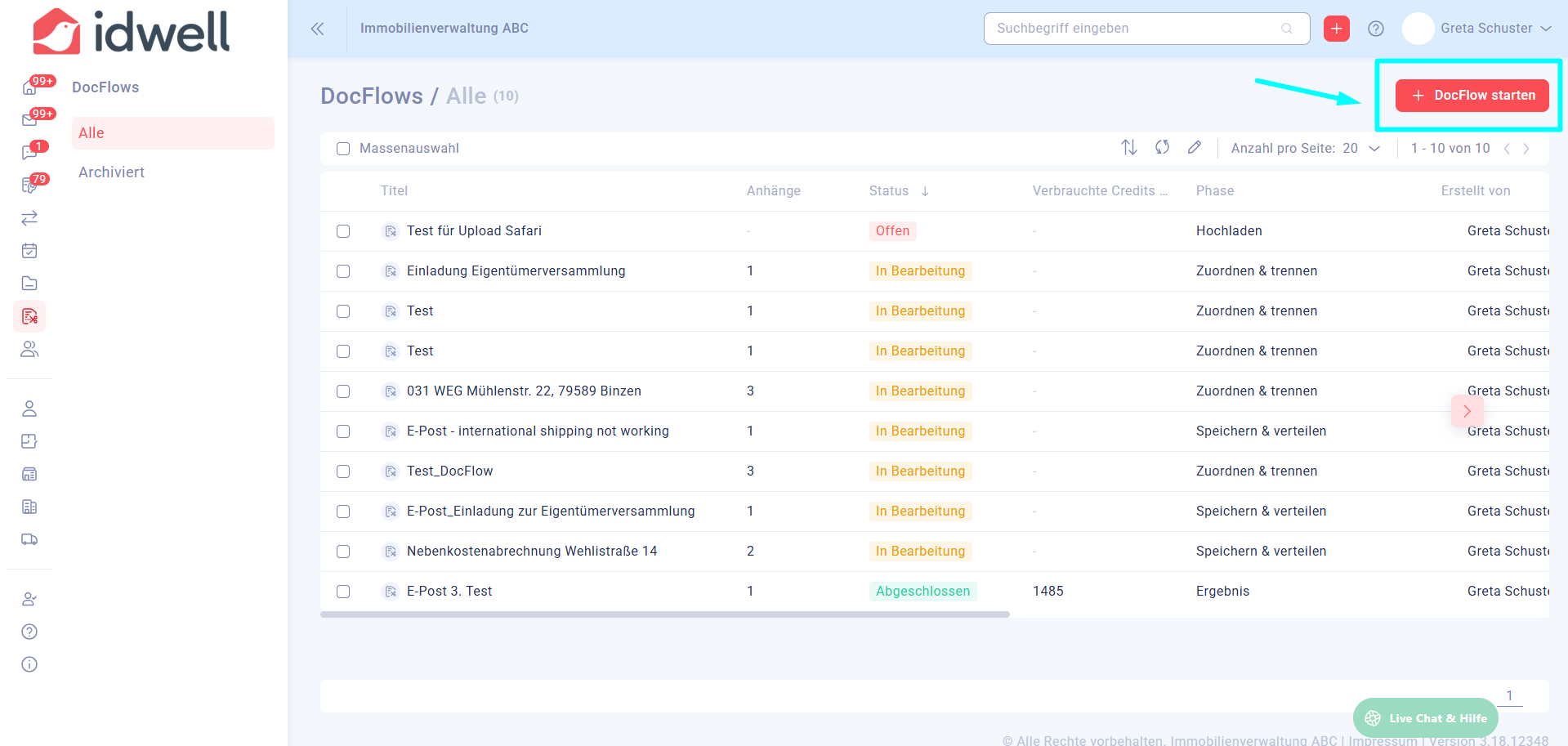 Erstellen Sie rechts oben im Eck einen neuen DocFlow, in dem Sie auf "DocFlow starten" klicken.