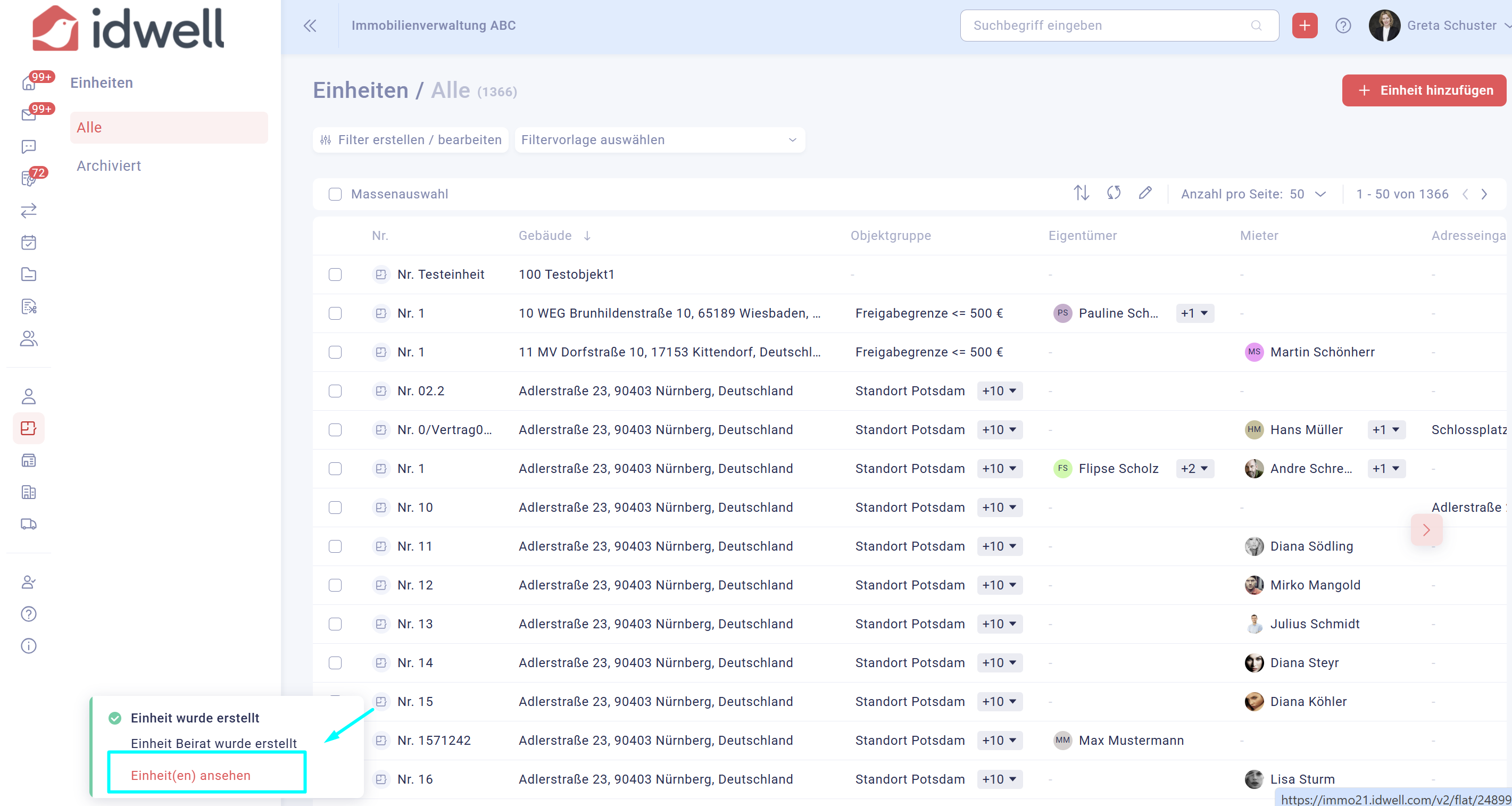 Klicken Sie auf "Erstellen" und links unten über das Pop-Up können Sie die neu erstellte Einheit direkt ansehen.