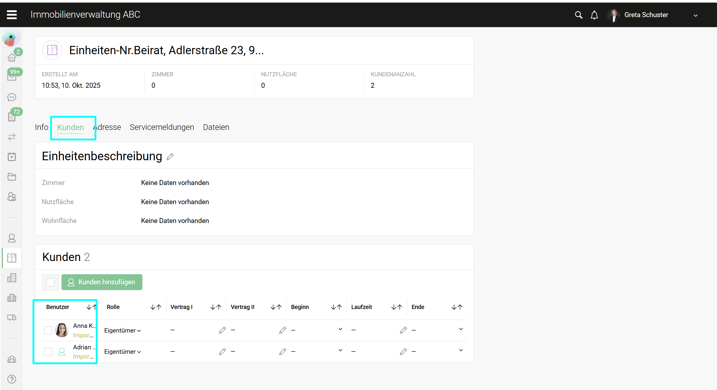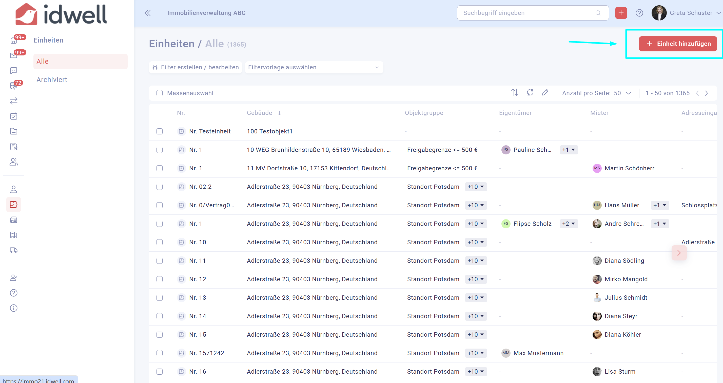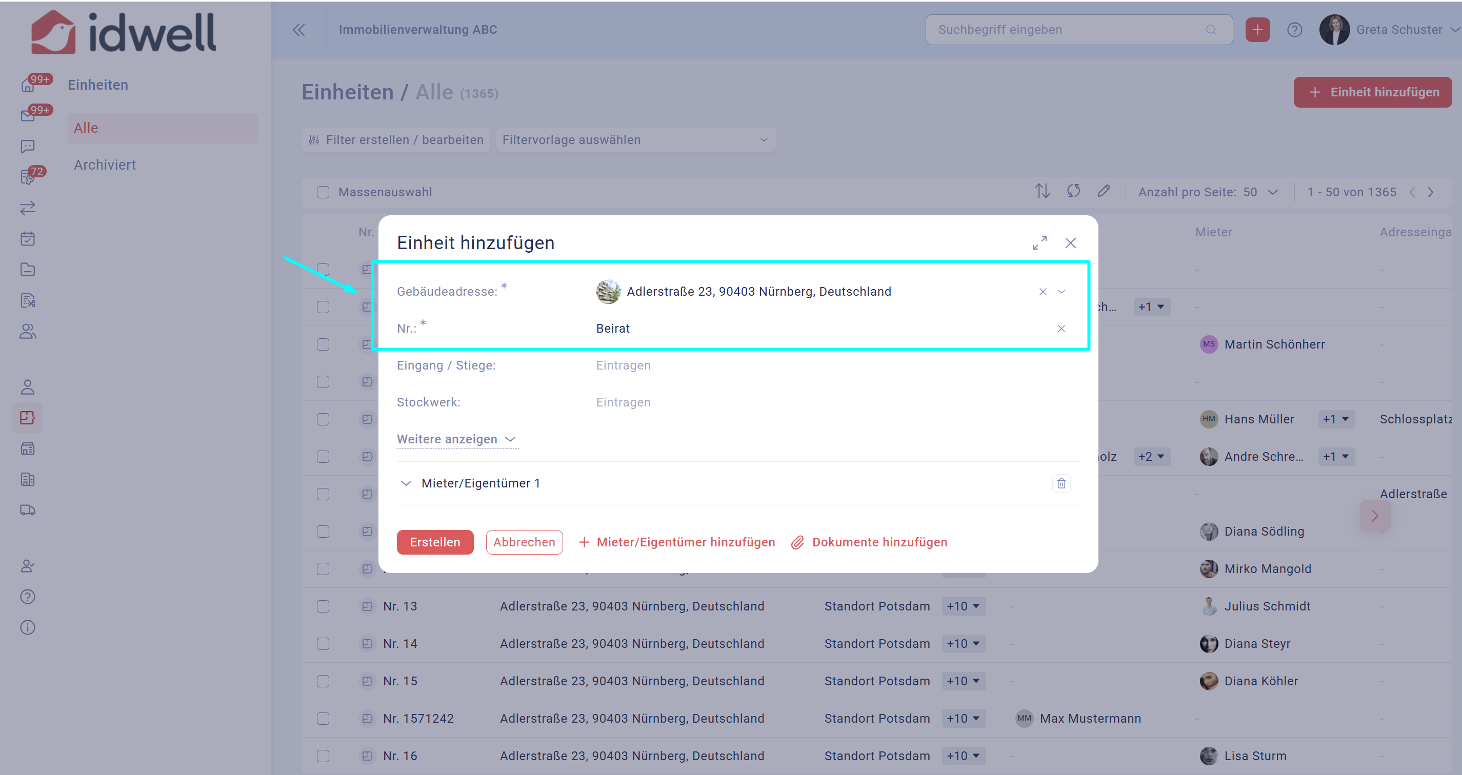 Suchen Sie die entsprechende Liegenschaft unter "Gebäude" aus und geben Sie der neuen Einheit bspw. die Bezeichnung "Beirat"