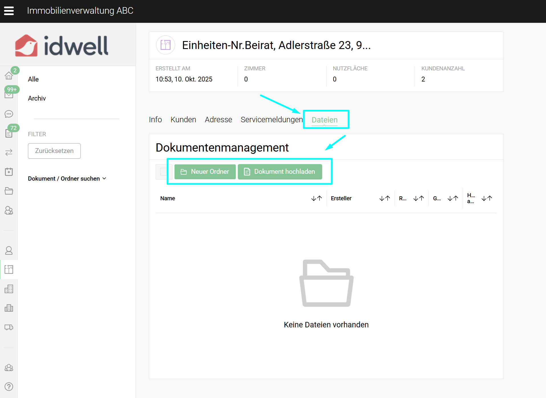 Unter "Dateien" können Sie die entsprechenden Ordnerstrukturen aufbauen und Dokumente hochladen.