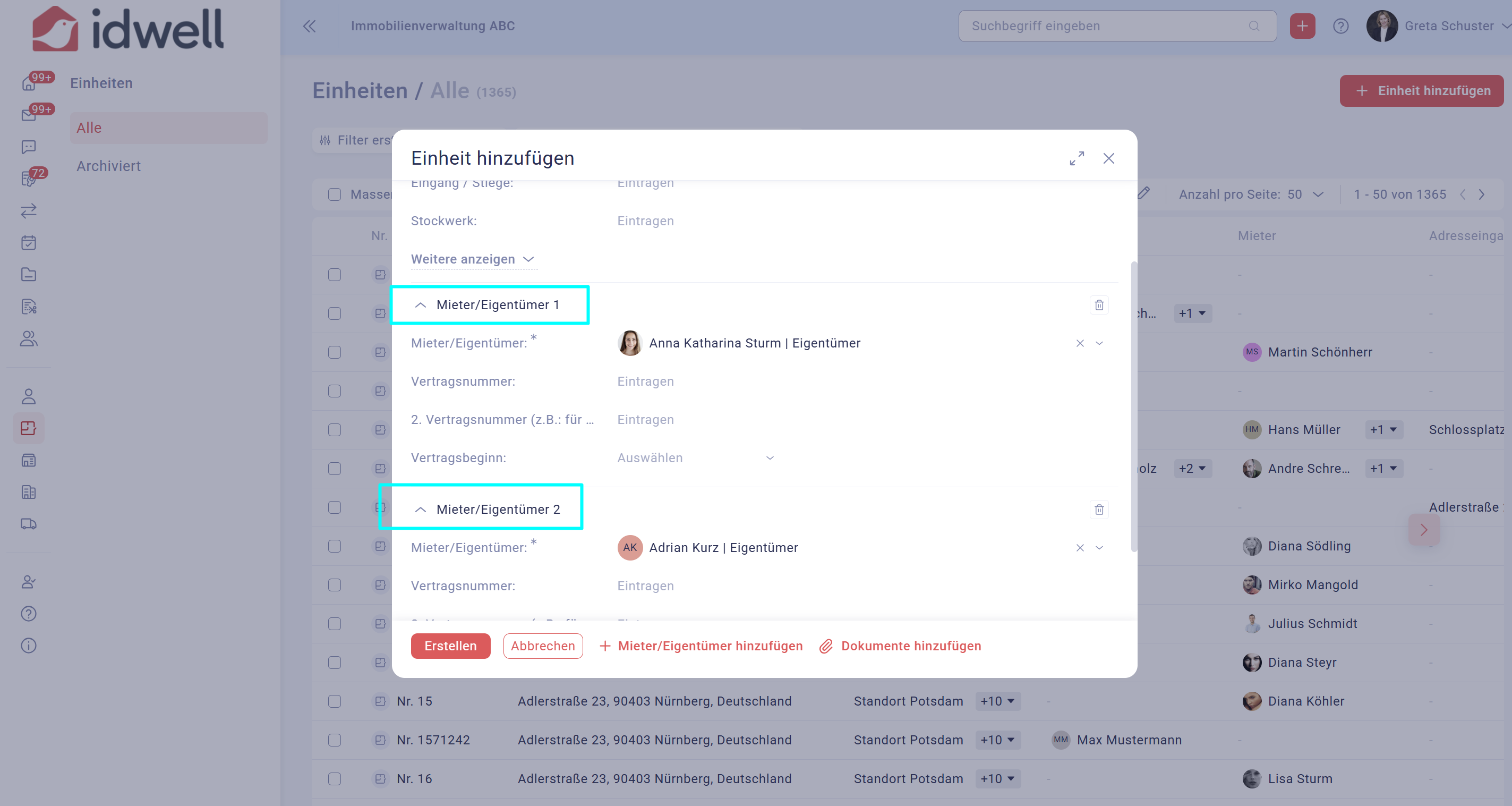 Klicken Sie nun auf "Mieter/Eigentümer hinzufügen" und wählen Sie die entsprechenden Beiräte aus. Sie können das Feld beliebig oft anklicken für den Fall dass es mehrere Beiräte gibt.