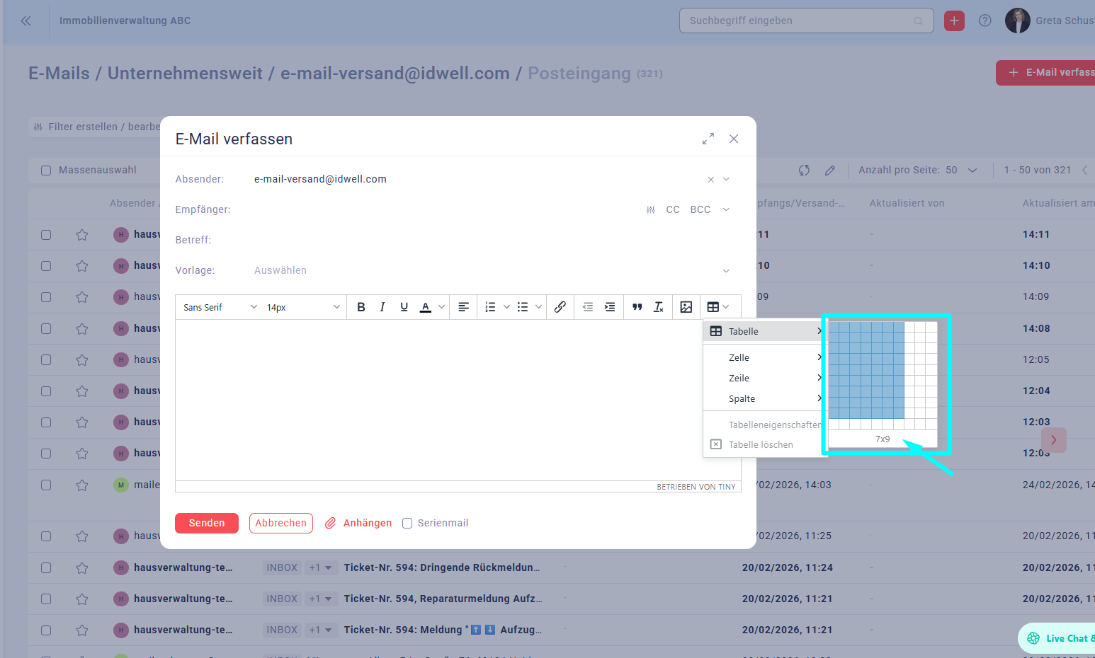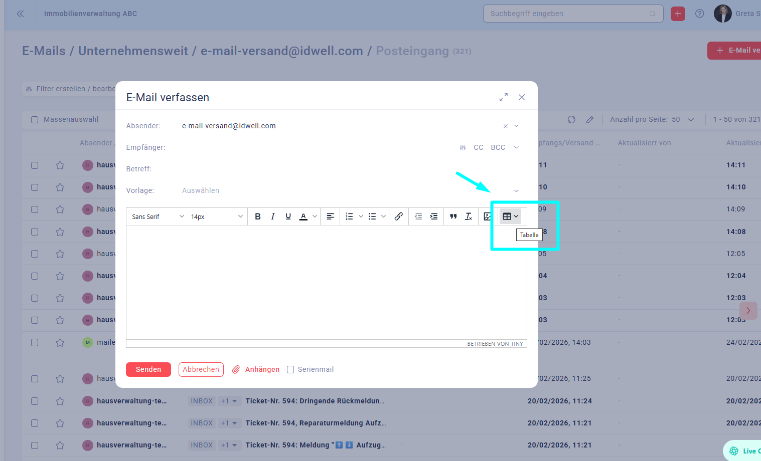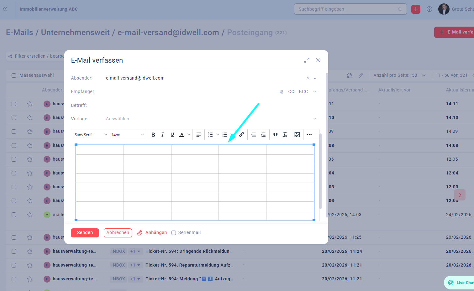 Wenn Sie ein E-Mail schreiben, können Sie über das Tabellen-Symbol (Raster-Icon) ganz einfach eine Tabelle einfügen. Tabellen eignen sich besonders für Termine, Preisübersichten oder Aufgabenlisten und sorgen für eine übersichtliche Darstellung.