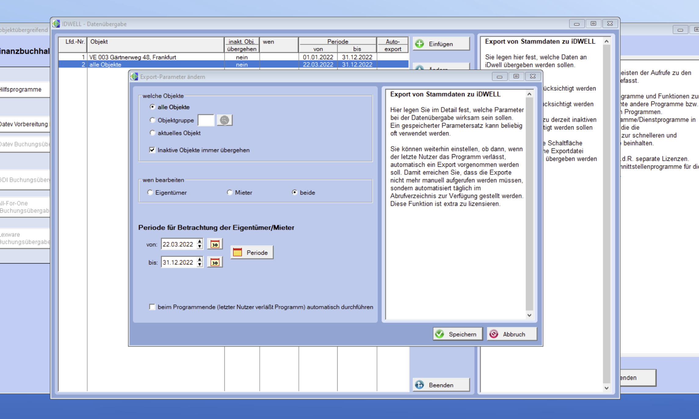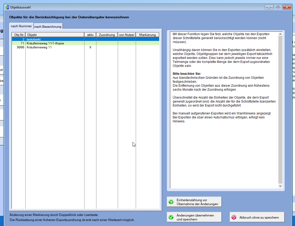 Sie können alle Objekte, bestimmte Objekte einer Objektgruppe oder einzelne Objekte übertragen. Inaktive Objekte können Sie übergehen oder ebenfalls einspielen. Ebenso haben Sie die Möglichkeit, eine Betrachtungsperiode für den Datenzugriff einzutragen.