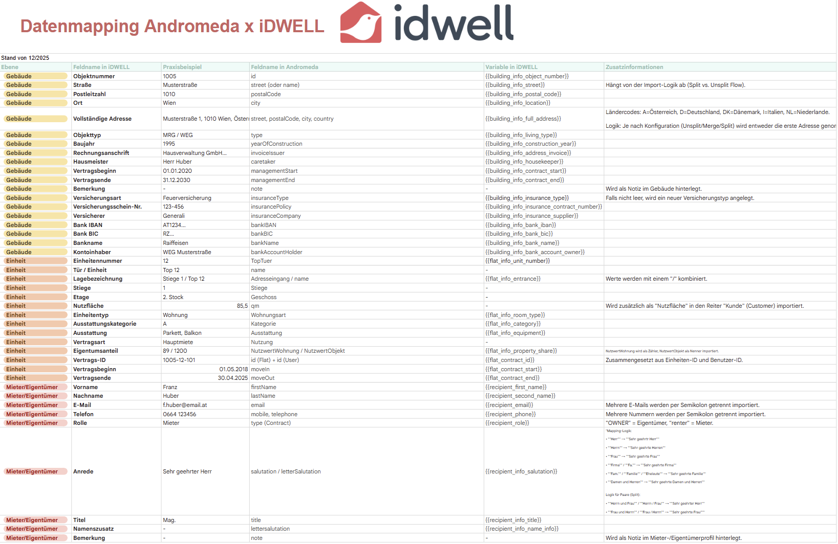 Aktualität und Vollständigkeit: Diese Dokumentation basiert auf der aktuellsten Version des Datenaustauschs zwischen iDWELL & Andromeda (Stand: Dezember 2025). Die korrekte und vollständige Befüllung der Quellfelder in Ihrem ERP-System liegt in Ihrer Verantwortung. Fehlerhafte Quelldaten führen zu fehlerhaften Zieldaten in iDWELL.