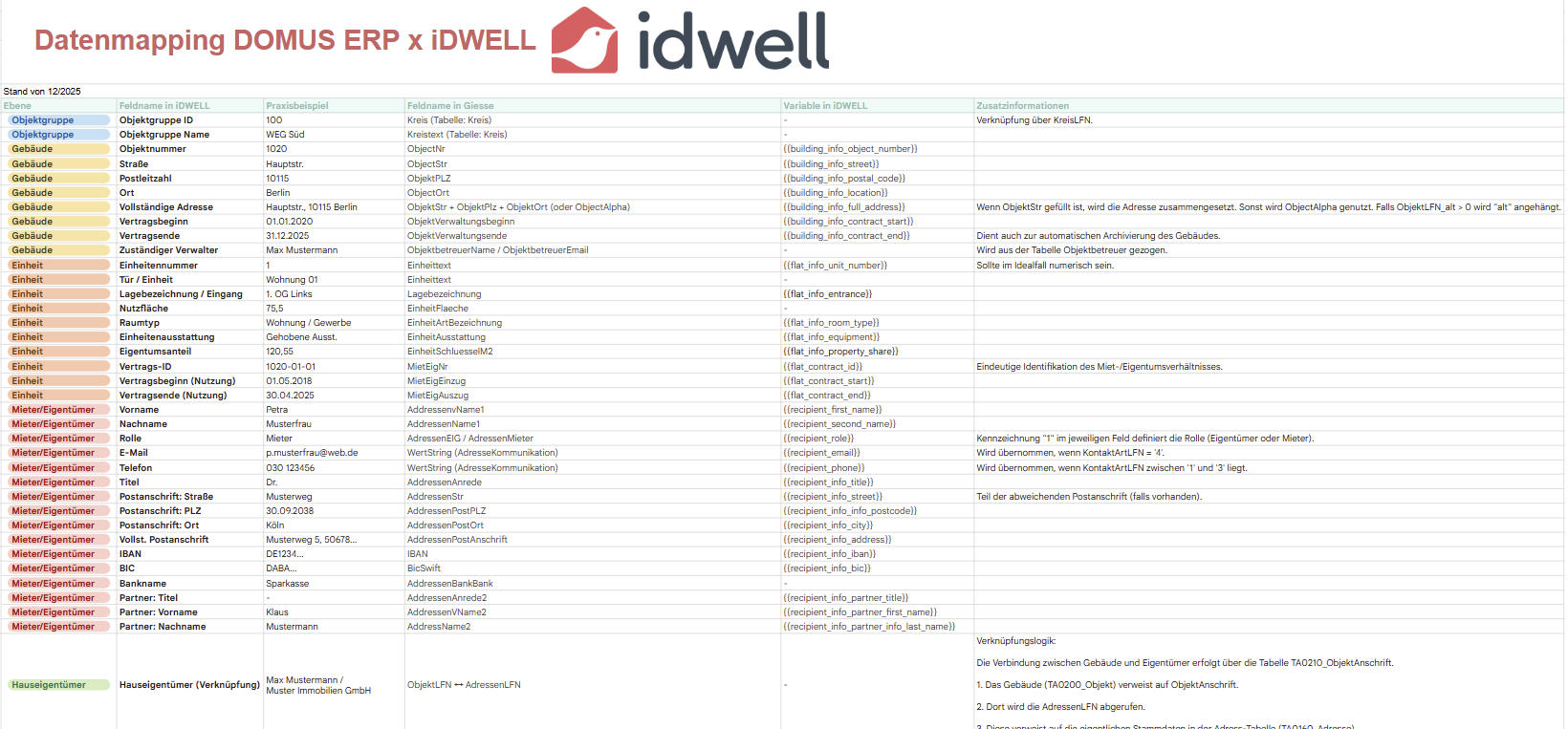 Aktualität und Vollständigkeit: Diese Dokumentation basiert auf der aktuellsten Version des Datenaustauschs zwischen iDWELL & DOMUS ERP (Stand: Dezember 2025). Die korrekte und vollständige Befüllung der Quellfelder in Ihrem ERP-System liegt in Ihrer Verantwortung. Fehlerhafte Quelldaten führen zu fehlerhaften Zieldaten in iDWELL.