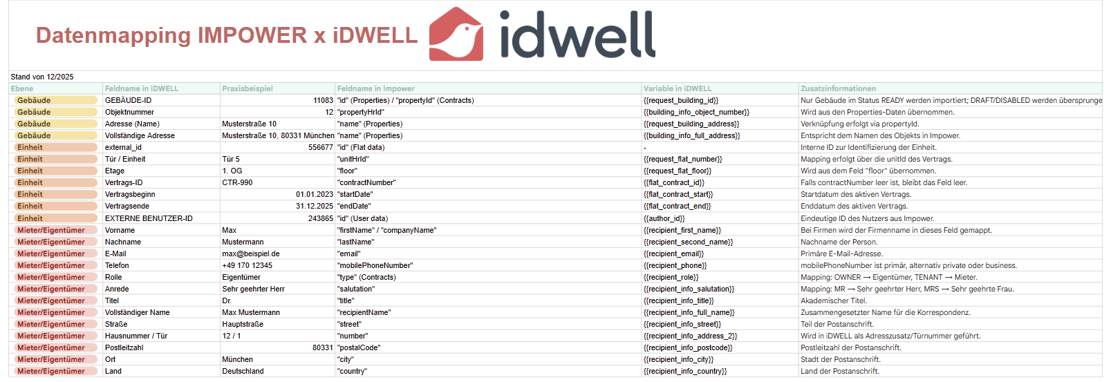Aktualität und Vollständigkeit: Diese Dokumentation basiert auf der aktuellsten Version des Datenaustauschs zwischen iDWELL & Impower (Stand: April 2026). Die korrekte und vollständige Befüllung der Quellfelder in Ihrem ERP-System liegt in Ihrer Verantwortung. Fehlerhafte Quelldaten führen zu fehlerhaften Zieldaten in iDWELL.