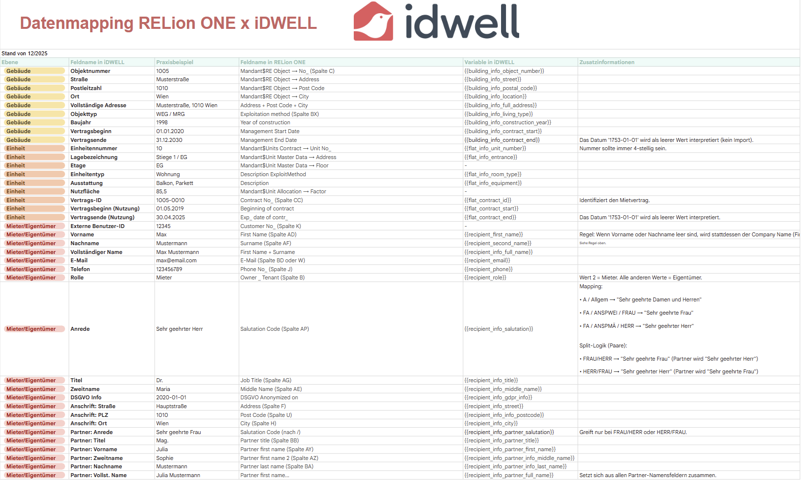 Aktualität und Vollständigkeit: Diese Dokumentation basiert auf der aktuellsten Version des Datenaustauschs zwischen iDWELL & RELion ONE (Stand: Dezember 2025). Die korrekte und vollständige Befüllung der Quellfelder in Ihrem ERP-System liegt in Ihrer Verantwortung. Fehlerhafte Quelldaten führen zu fehlerhaften Zieldaten in iDWELL.