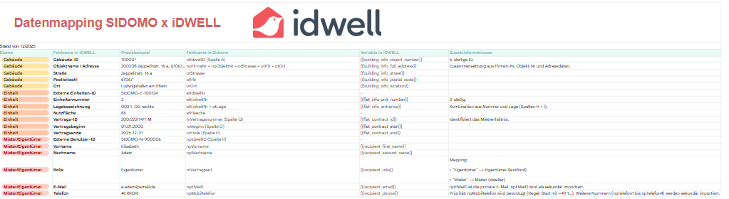 Aktualität und Vollständigkeit: Diese Dokumentation basiert auf der aktuellsten Version des Datenaustauschs zwischen iDWELL & Sidomo (Stand: Dezember 2025). Die korrekte und vollständige Befüllung der Quellfelder in Ihrem ERP-System liegt in Ihrer Verantwortung. Fehlerhafte Quelldaten führen zu fehlerhaften Zieldaten in iDWELL.