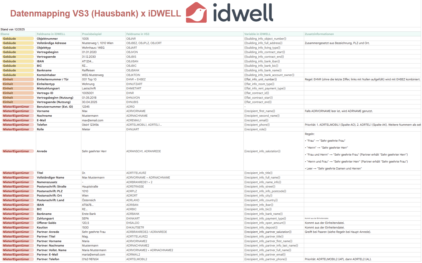 Aktualität und Vollständigkeit: Diese Dokumentation basiert auf der aktuellsten Version des Datenaustauschs zwischen iDWELL & VS3 (Stand: Dezember 2025). Die korrekte und vollständige Befüllung der Quellfelder in Ihrem ERP-System liegt in Ihrer Verantwortung. Fehlerhafte Quelldaten führen zu fehlerhaften Zieldaten in iDWELL.