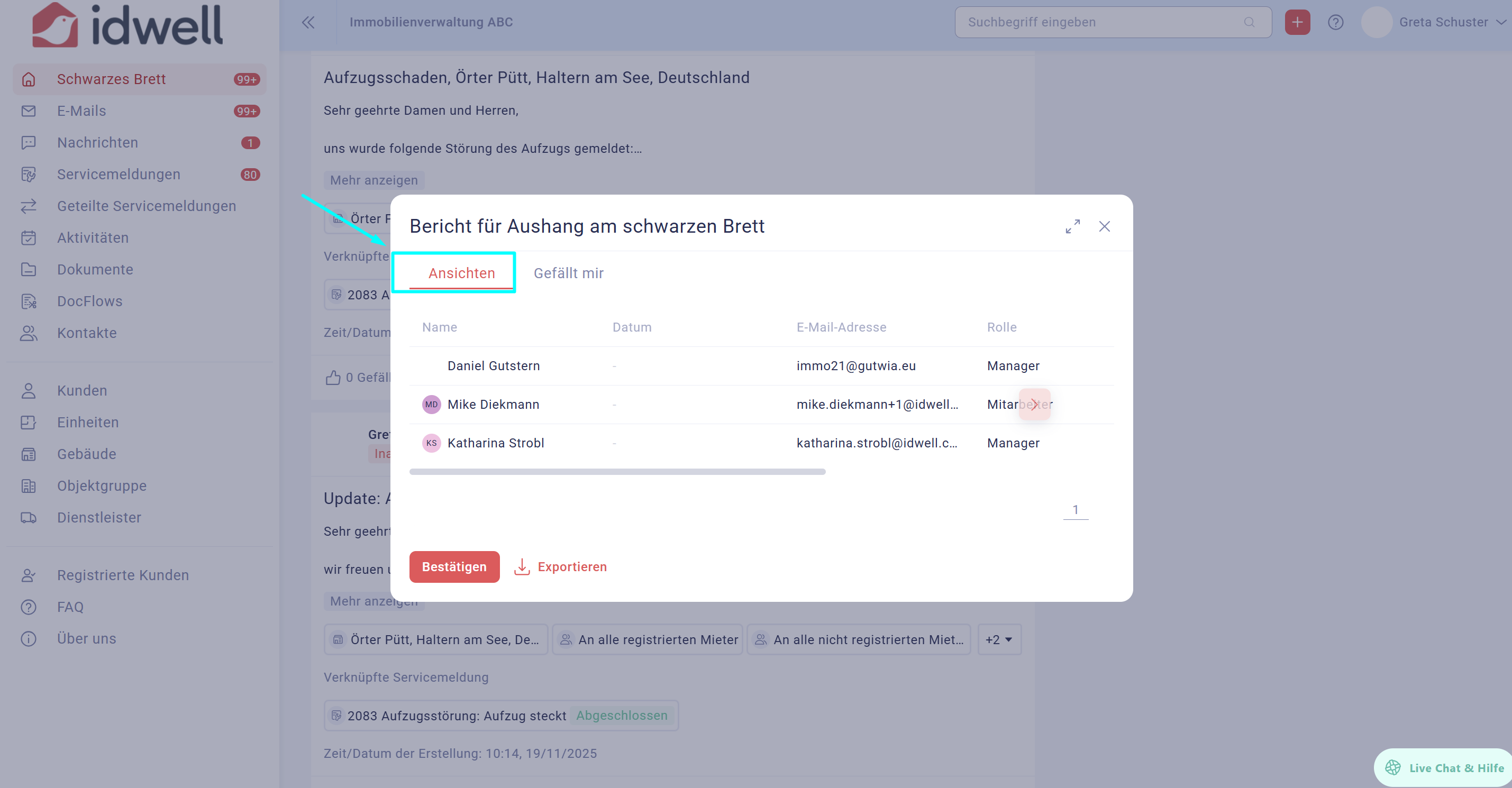 Nun können Sie sich ansehen, wer sich den Aushang wann angesehen hat. Damit kann zu 100 % festgestellt werden, dass der Kunde den Aushang auch wirklich gelesen hat. Zusätzlich zu Kundennamen und Datum sehen Sie auch die E-Mail-Adresse, an die der Aushang gesendet wurde, und die Rolle des Kunden (Mieter/Eigentümer).