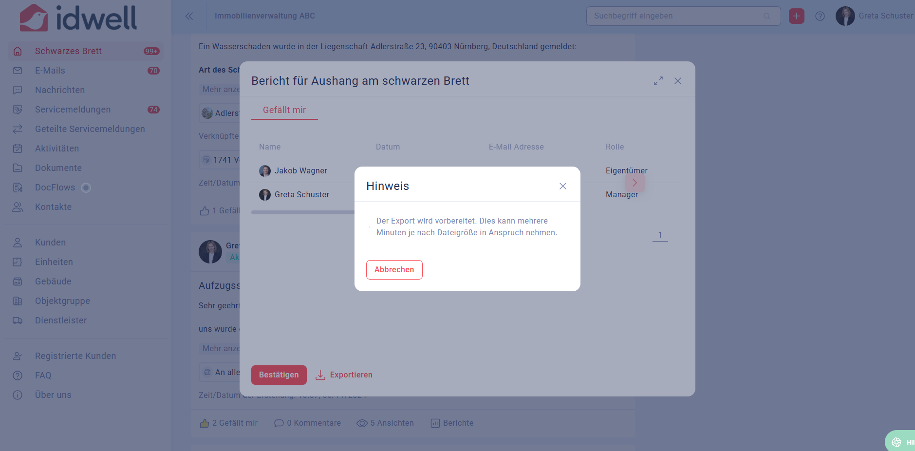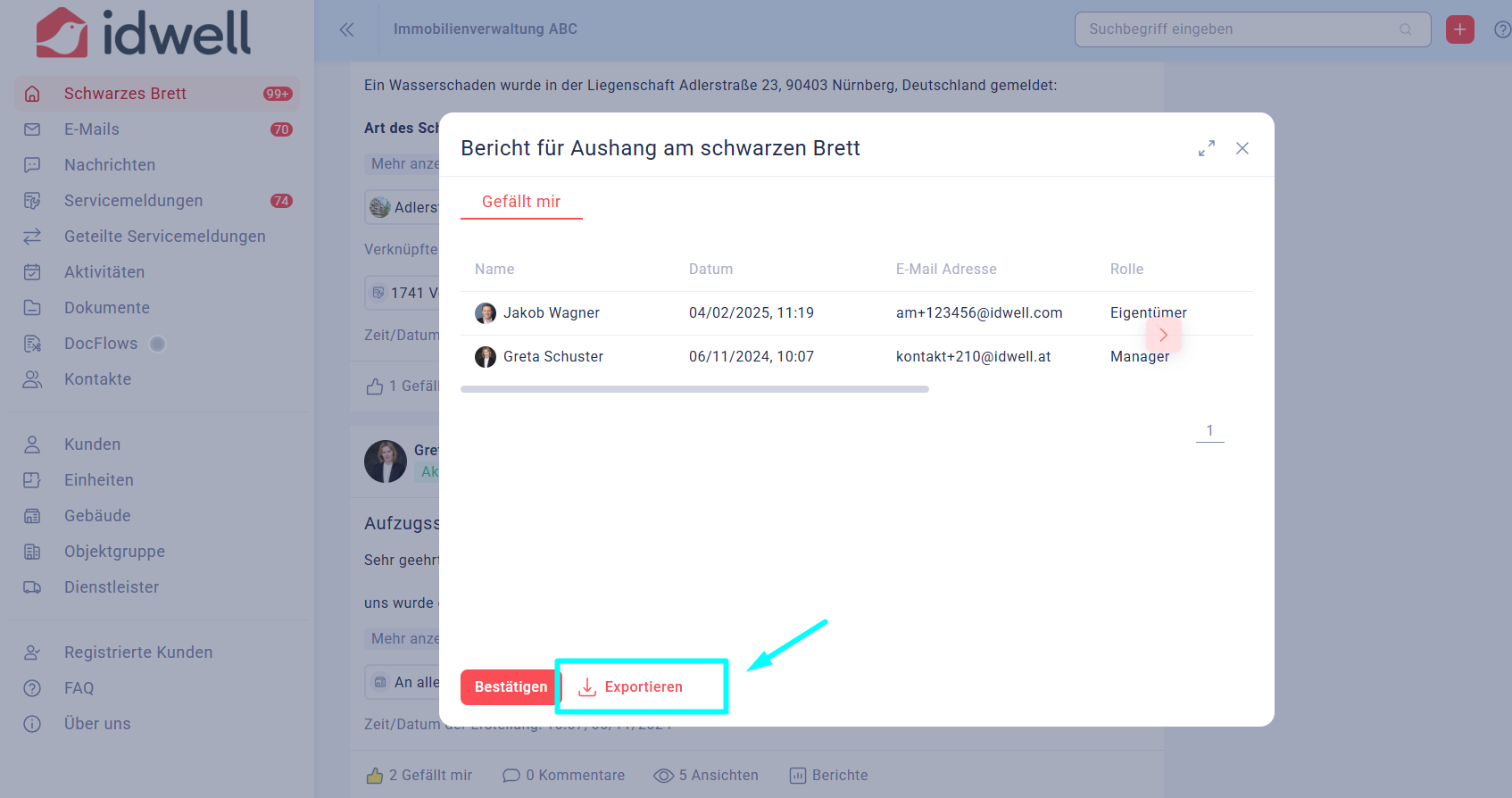 Nun können Sie sich ansehen, wer den Aushang wann mit "Gefällt mir" markiert hat. Damit kann zu 100 % festgestellt werden, dass der Kunde den Aushang auch wirklich gelesen hat. Zusätzlich zu Kundennamen und Datum sehen Sie auch die E-Mail-Adresse, an die der Aushang gesendet wurde, und die Rolle des Kunden (Mieter/Eigentümer).