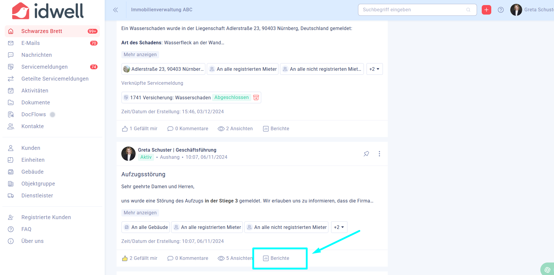 Klicken Sie beim entsprechenden Aushang auf "Berichte".
