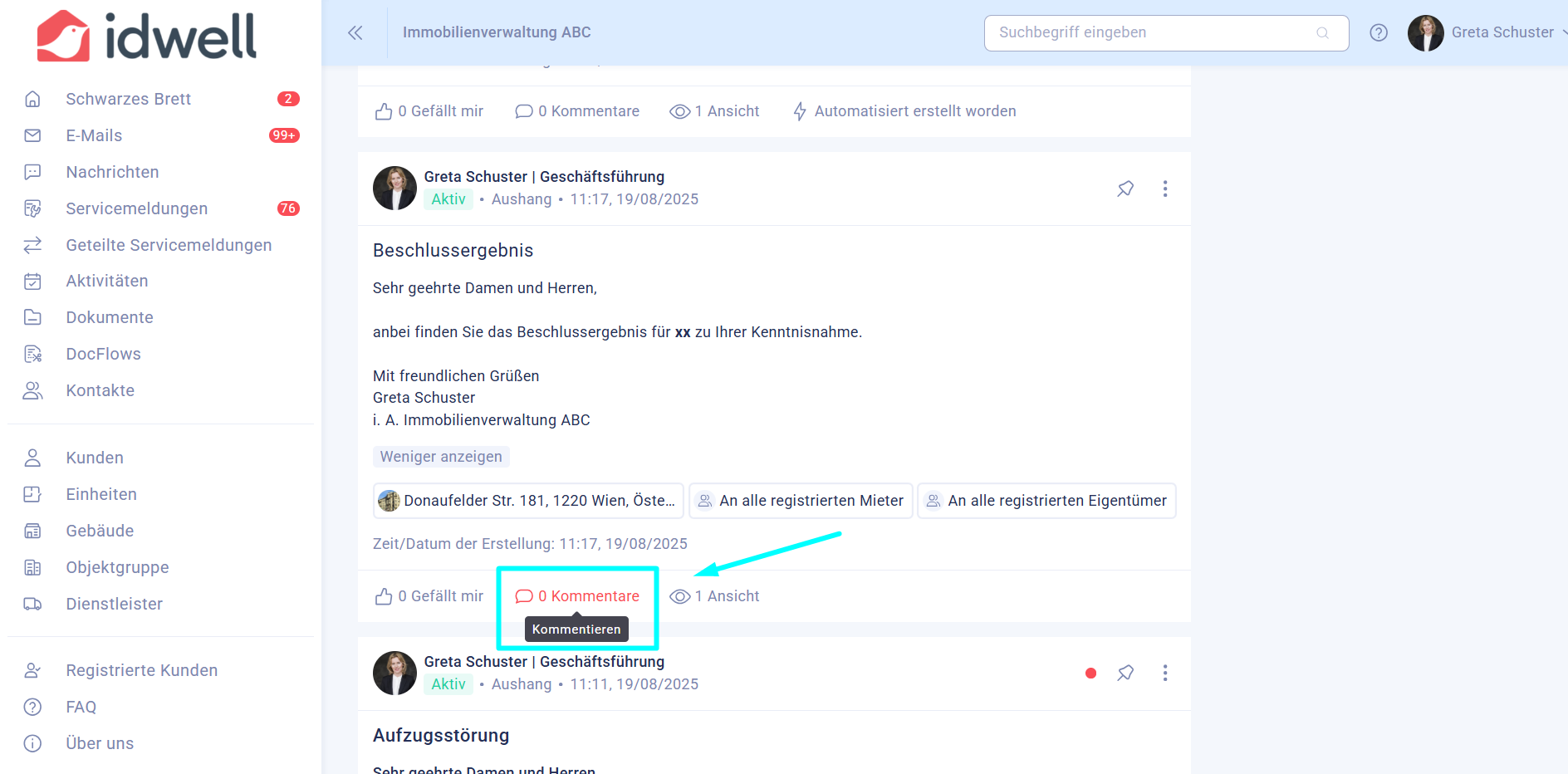 Klicken Sie auf die Sprechblase unterhalb Ihres Aushangs.