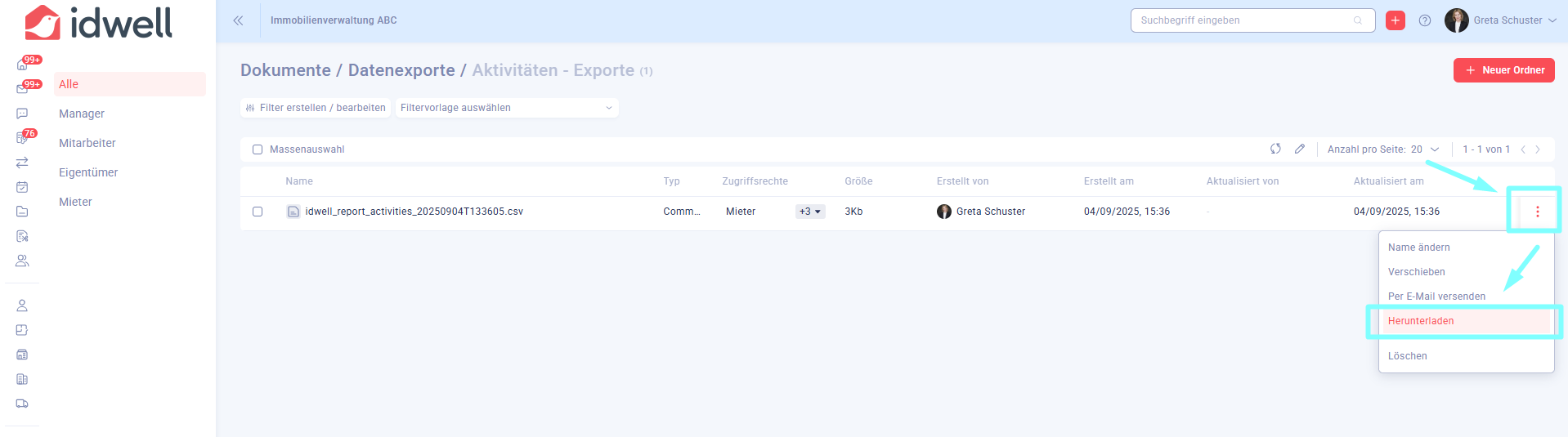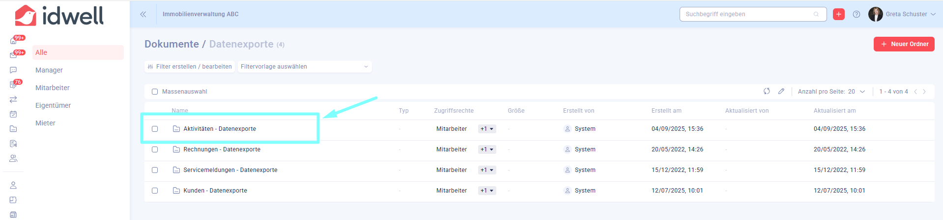 Wählen Sie nun den Ordner "Datenexporte" und dann Aktivitäten - CSV-Exporte " aus. Darin befindet sich nun die CSV-Datei, welche Sie herunterladen können (je nach der Datenvolumen kann es einige Minuten in Anspruch nehmen, bis die Datei generiert wurde).