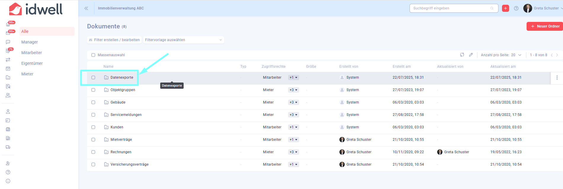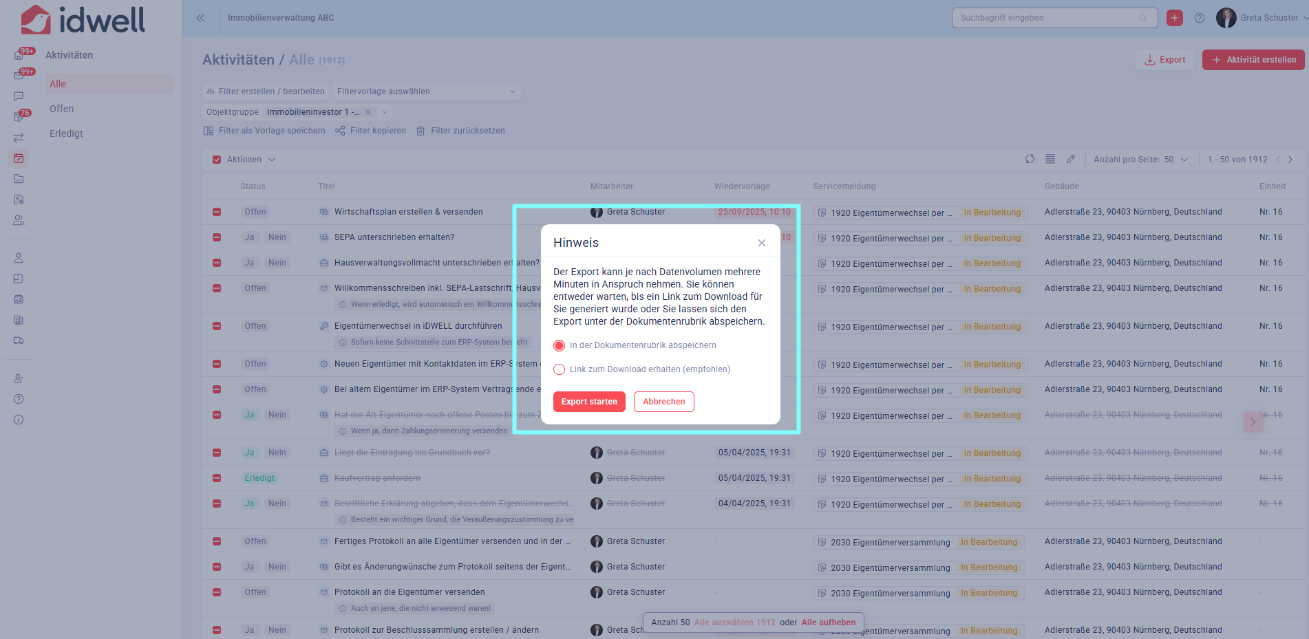 - Option 1: Der Export wird gestartet und Sie finden diesen später unter der Rubrik "Dokumente".