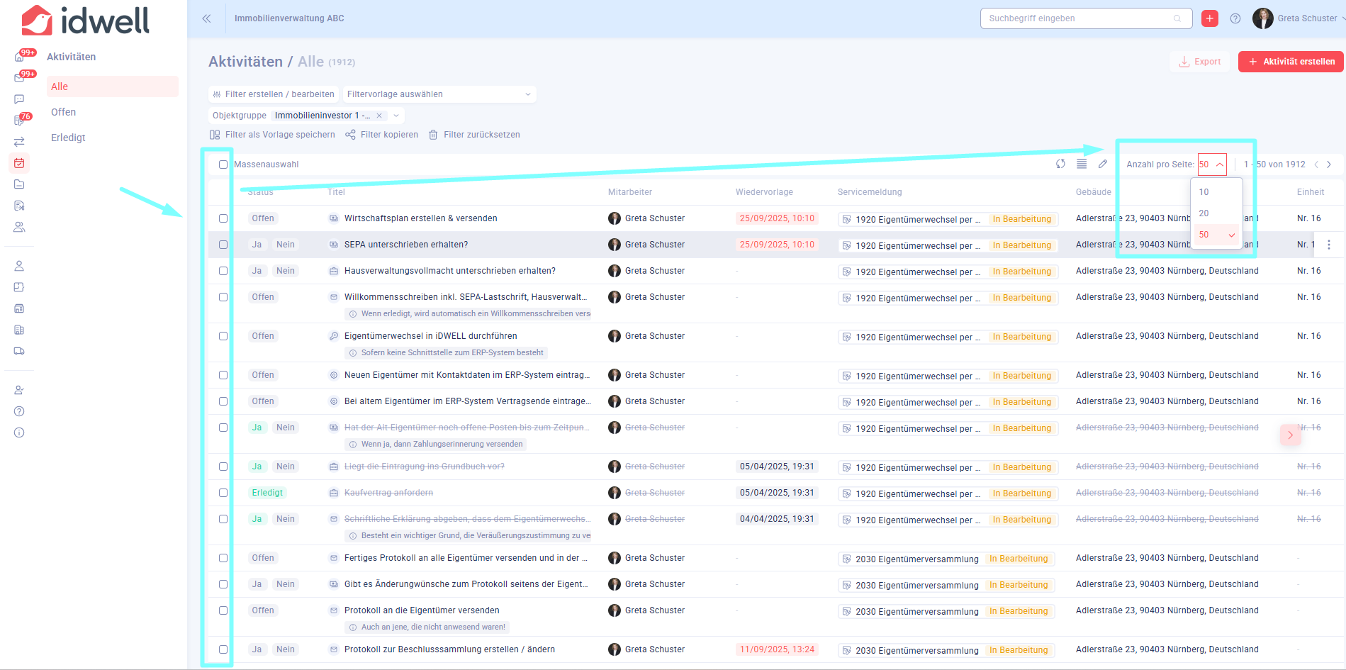 Nun sehen Sie alle gefilterten Kundendaten (in unserem Beispiel alle Aktivitäten aus der Objektgruppe "Immobilieninvestor 1").