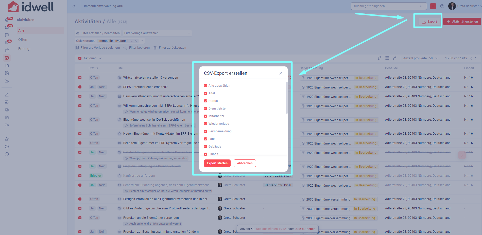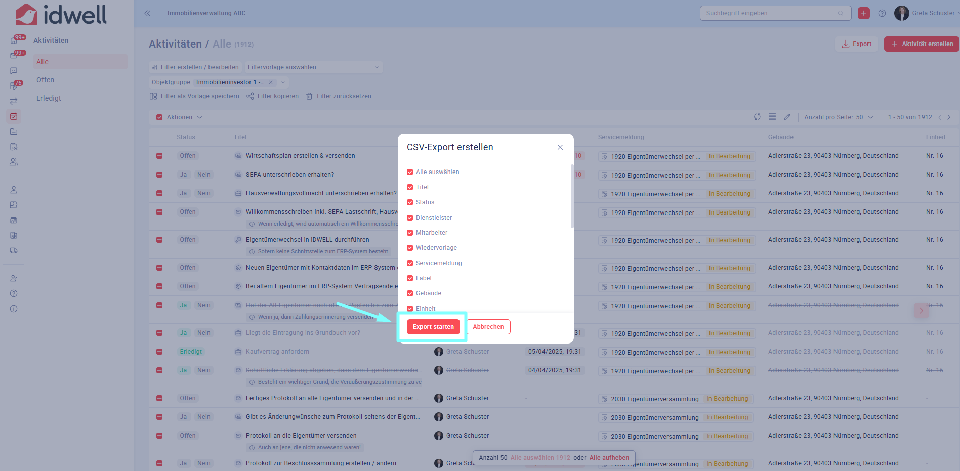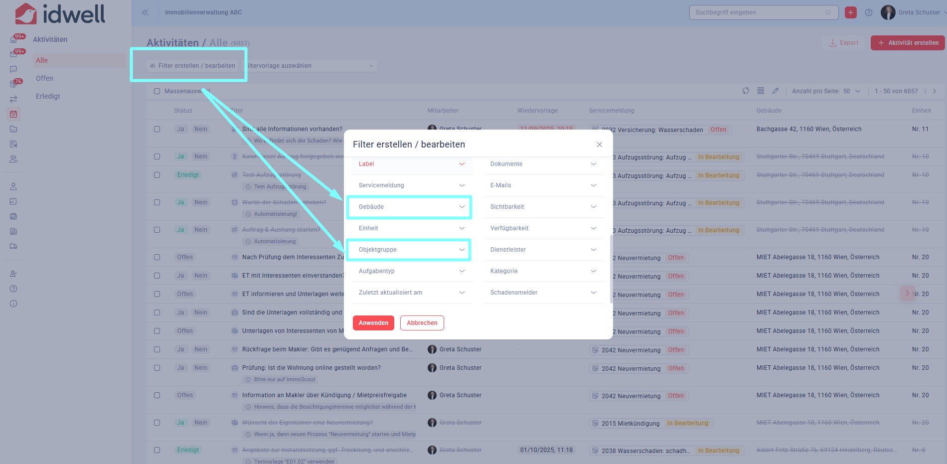 Wählen Sie links oben "Filter erstellen / bearbeiten" aus und suchen Sie beispielsweise über "Gebäude" nach einer konkreten Liegenschaft oder über "Objektgruppe" nach einem bestimmten Portfolio, dessen Aktivitätsliste Sie exportieren möchten.
