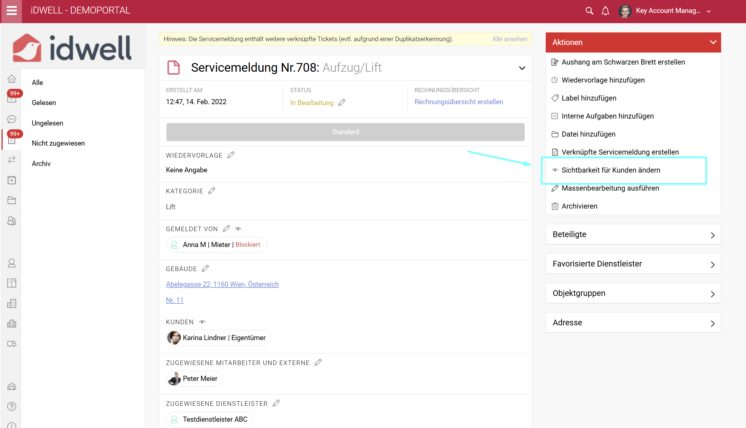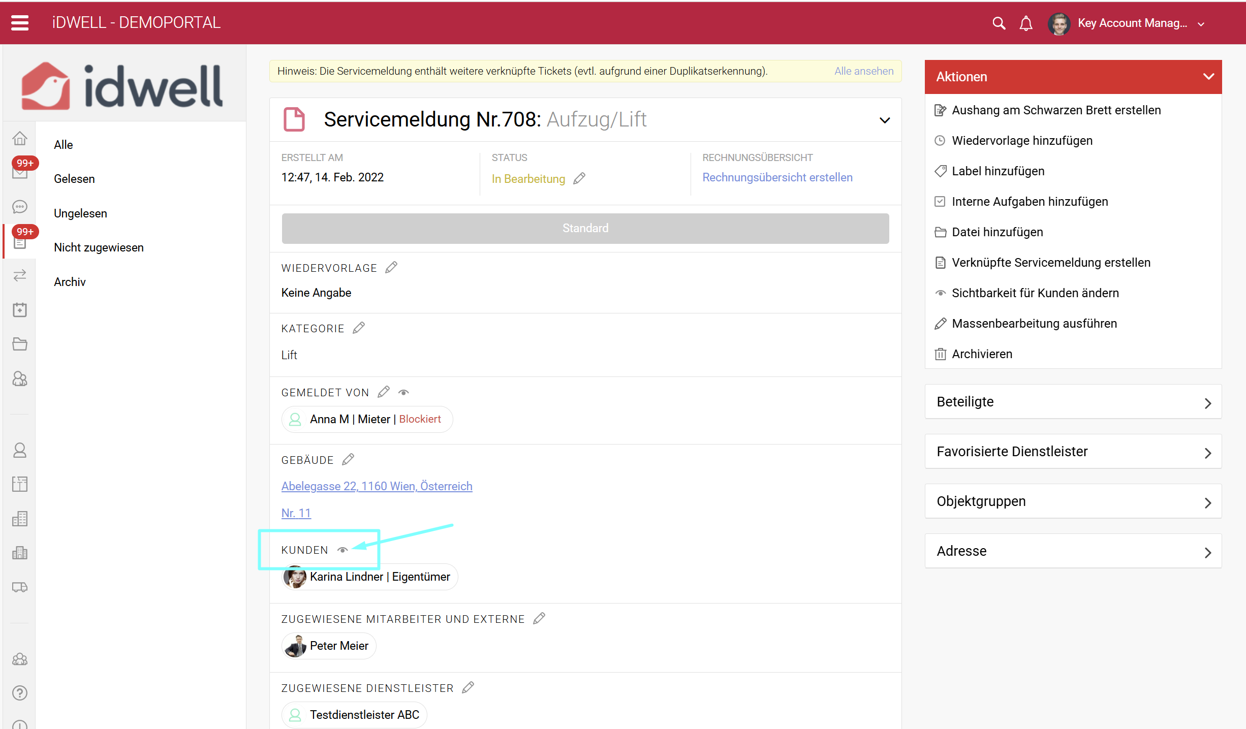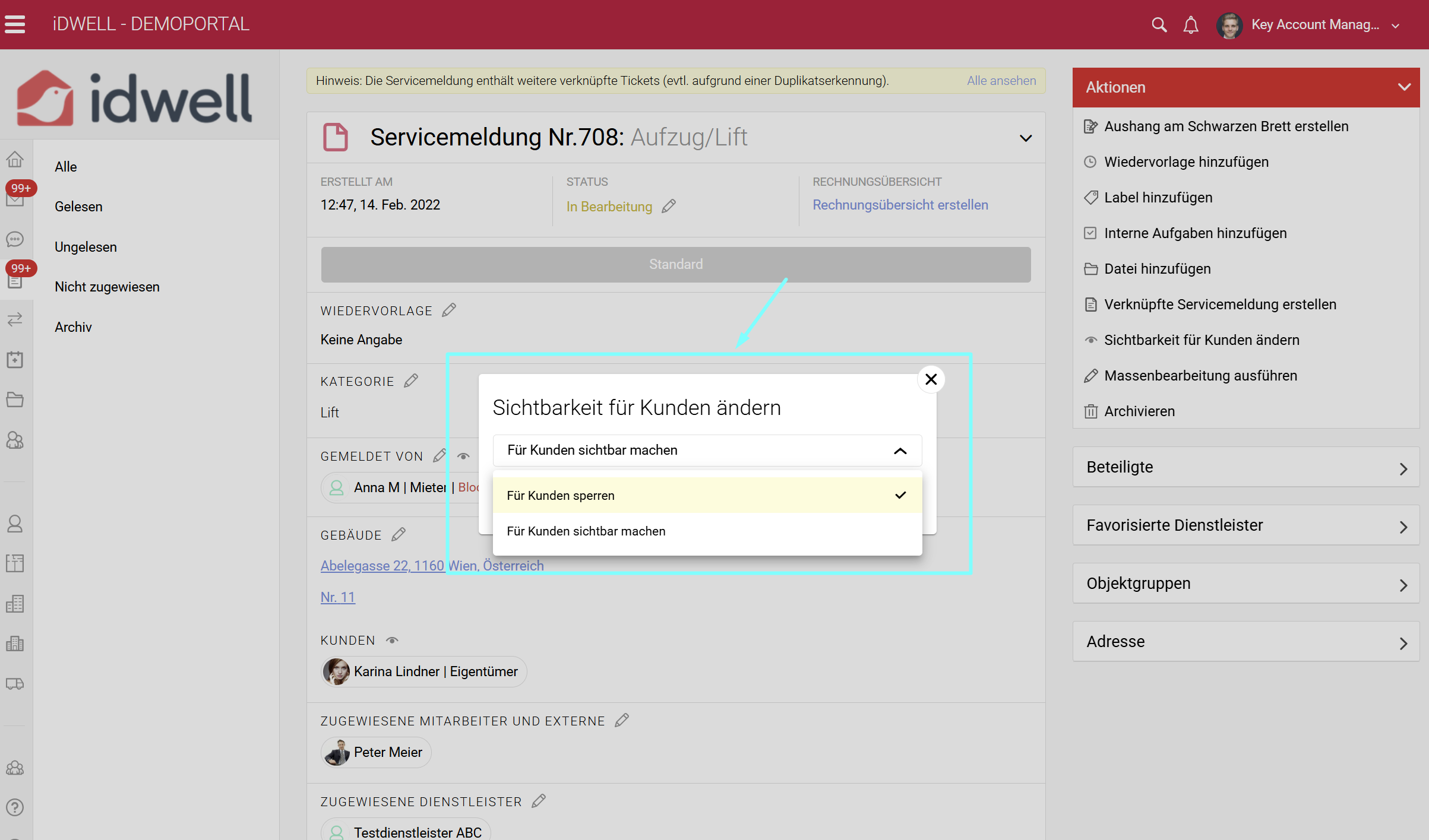 Sie können Servicemeldungen flexibel für Mieter oder Eigentümer sperren, auch wenn die Meldungen noch nicht archiviert worden sind. Dies ist besonders relevant für sensible Fälle wie Gerichtsprozesse, Mahnverfahren oder interne Themen, die nicht für Kunden sichtbar sein sollen.