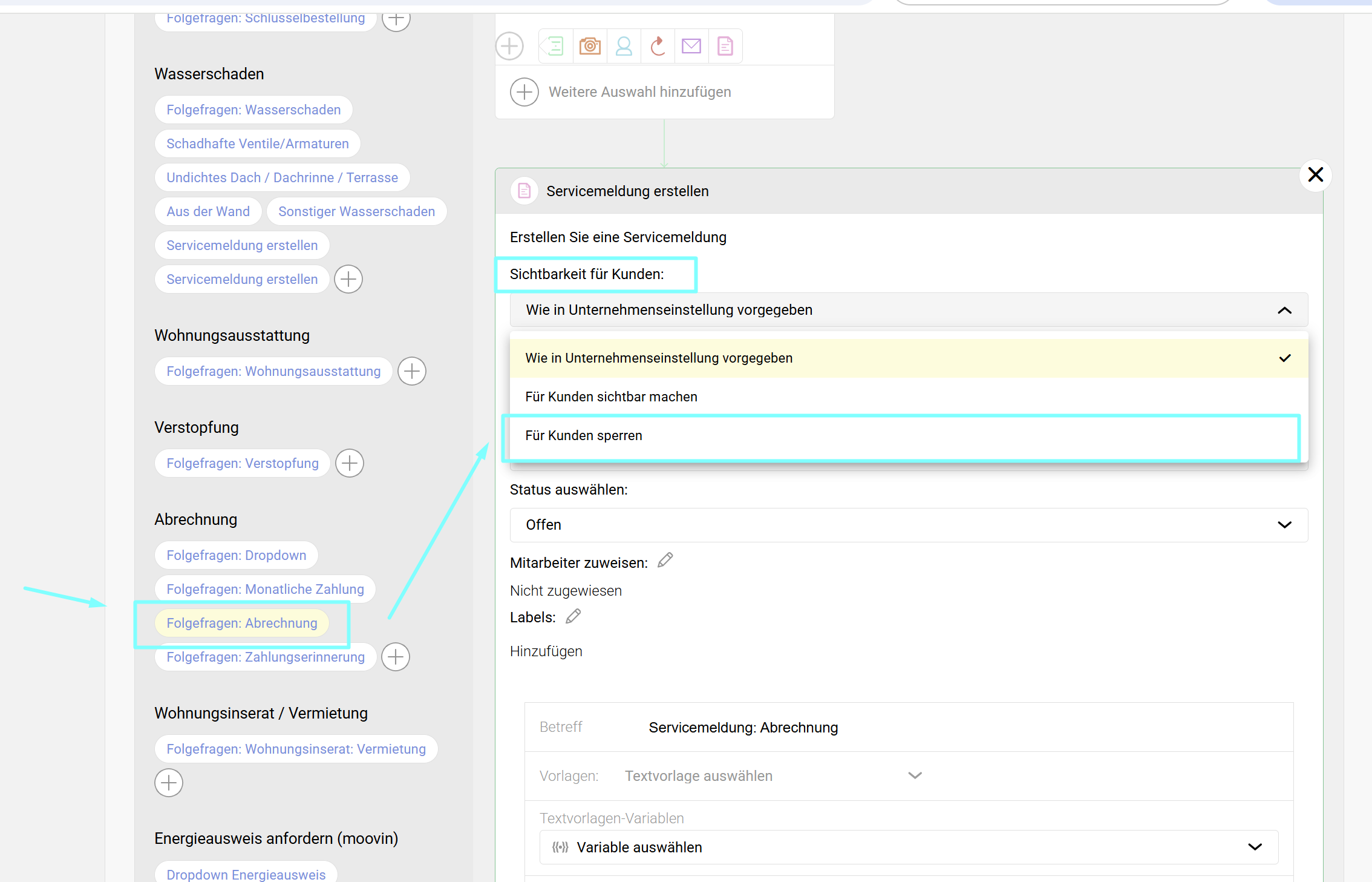Wählen Sie eine entsprechende "Blase" für eine Kategorie aus und scrollen Sie zur Schablone für die Servicemeldung. Klicken Sie dort in das Dropdown-Menü "Sichtbarkeit für Kunden".
