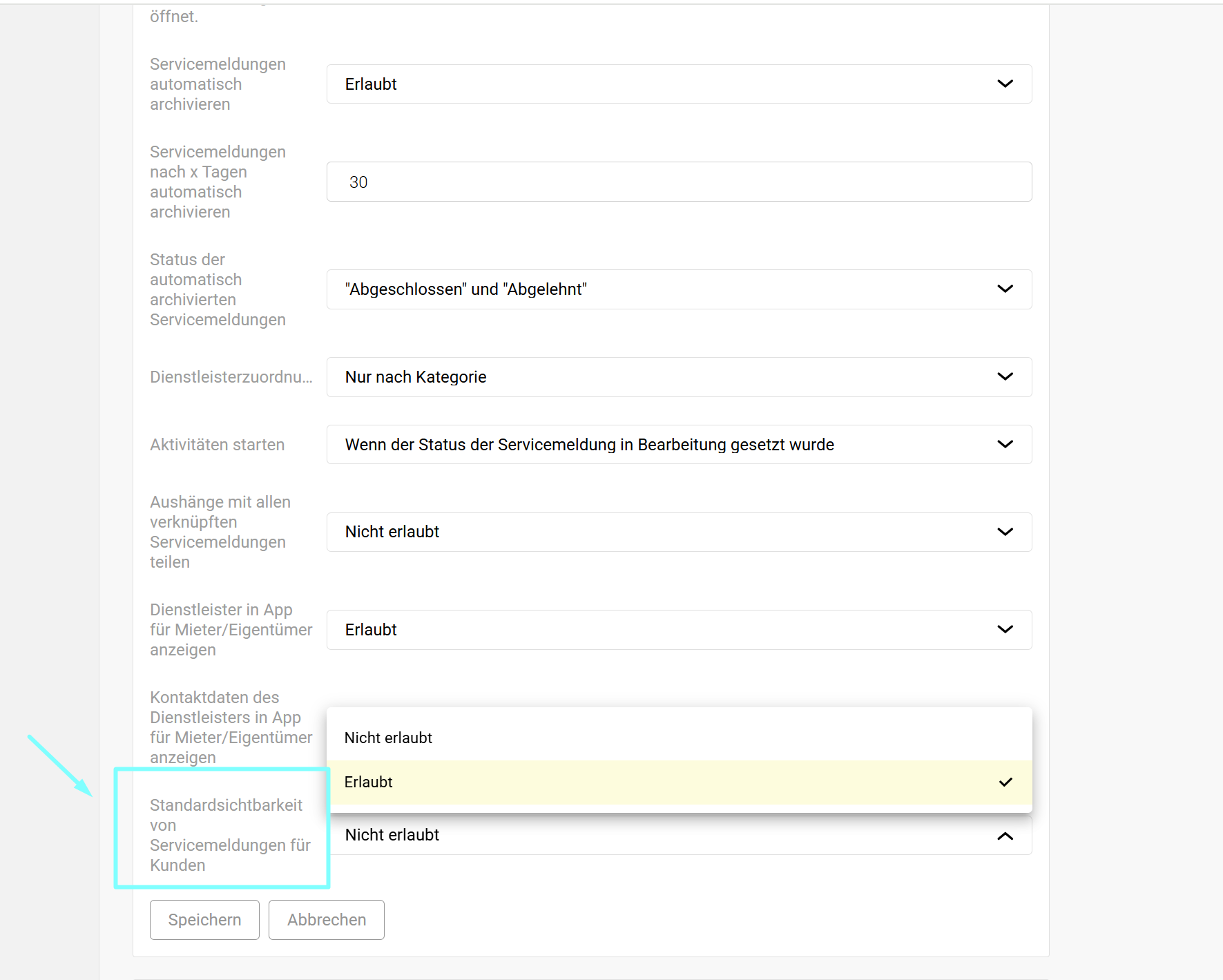 Bei den "Unternehmens-Einstellungen für die Servicemeldungen" können Sie den Befehl "Standardsichtbarkeit von Servicemeldung für Kunden" auf "Erlaubt" oder "Nicht erlaubt" setzen.