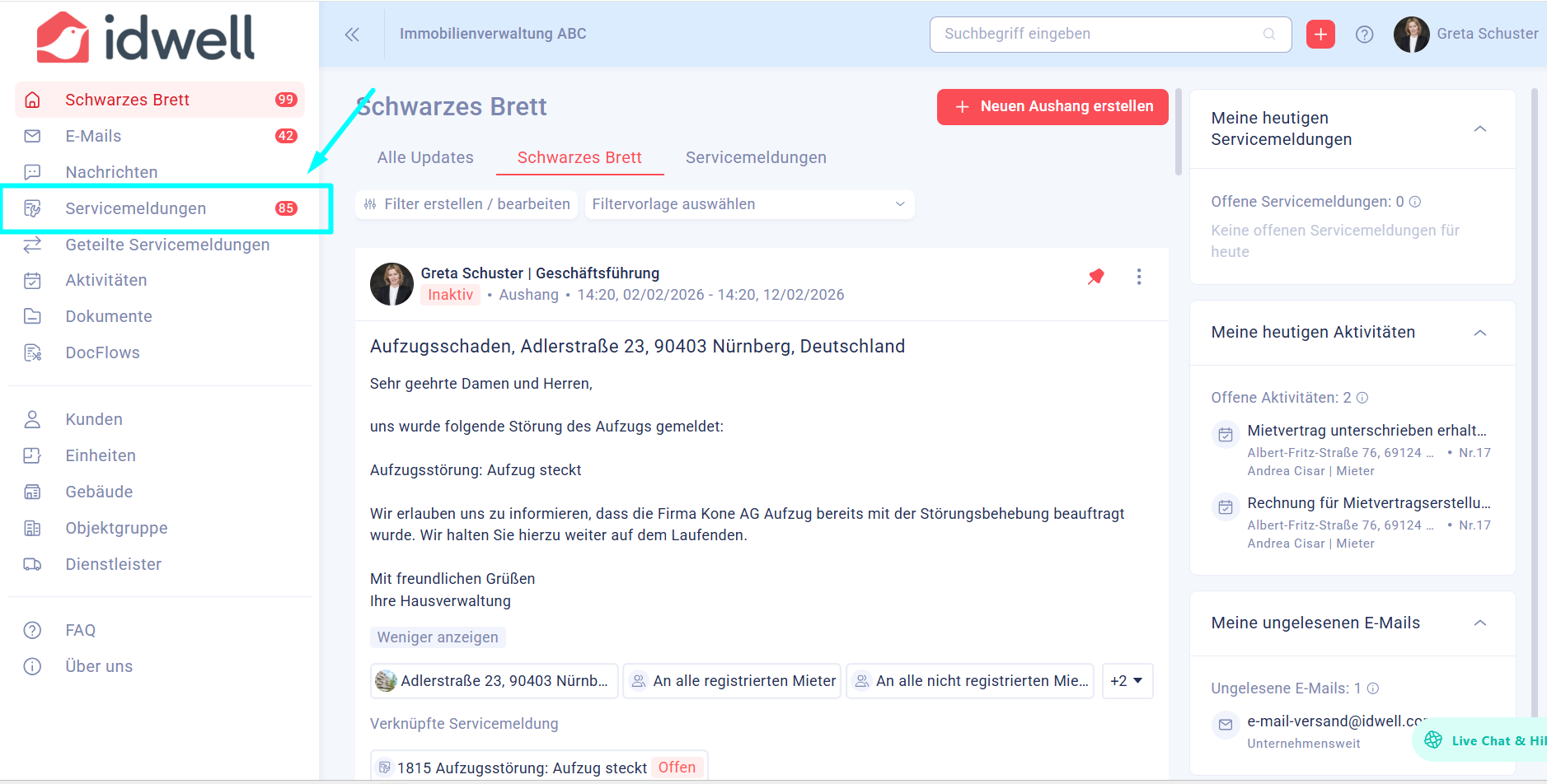 Servicemeldungen öffnen: Navigieren Sie zum Modul Servicemeldungen.