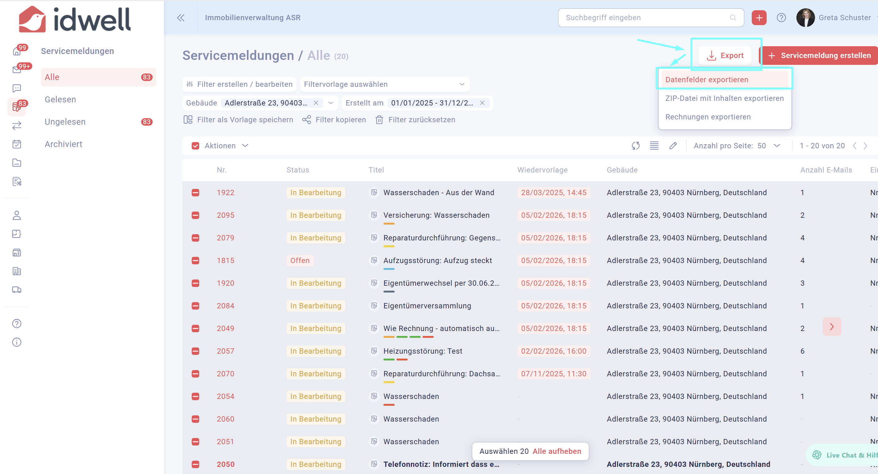 Setzen Sie eine Massenauswahl der Servicemeldungen, die Sie exportieren wollen.