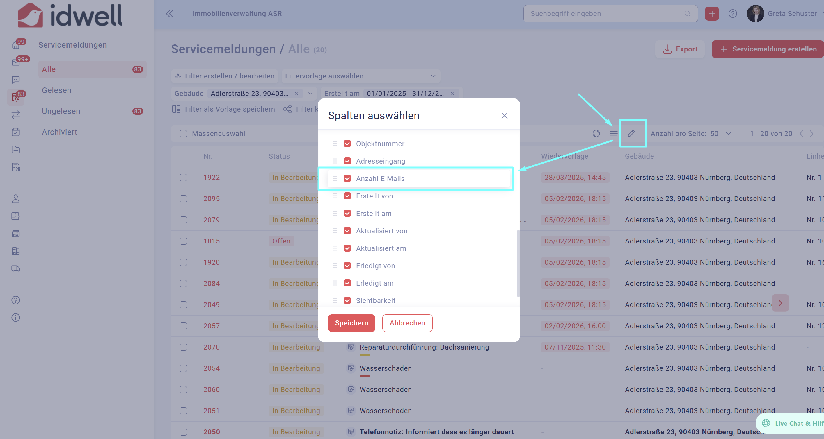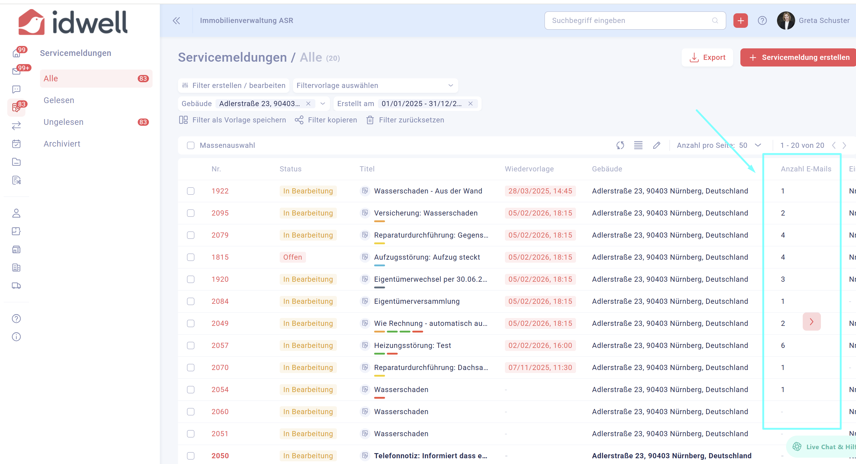 In der Eigentümerversammlung kommt oft die Frage auf: „Was macht die Hausverwaltung eigentlich den ganzen Tag?“ Um Ihren Arbeitsaufwand bei komplexen Fällen schwarz auf weiß belegen zu können, bietet iDWELL nun eine neue Kennzahl in der Ticket-Übersicht: Die Anzahl der geschriebenen E-Mails pro Servicemeldung.