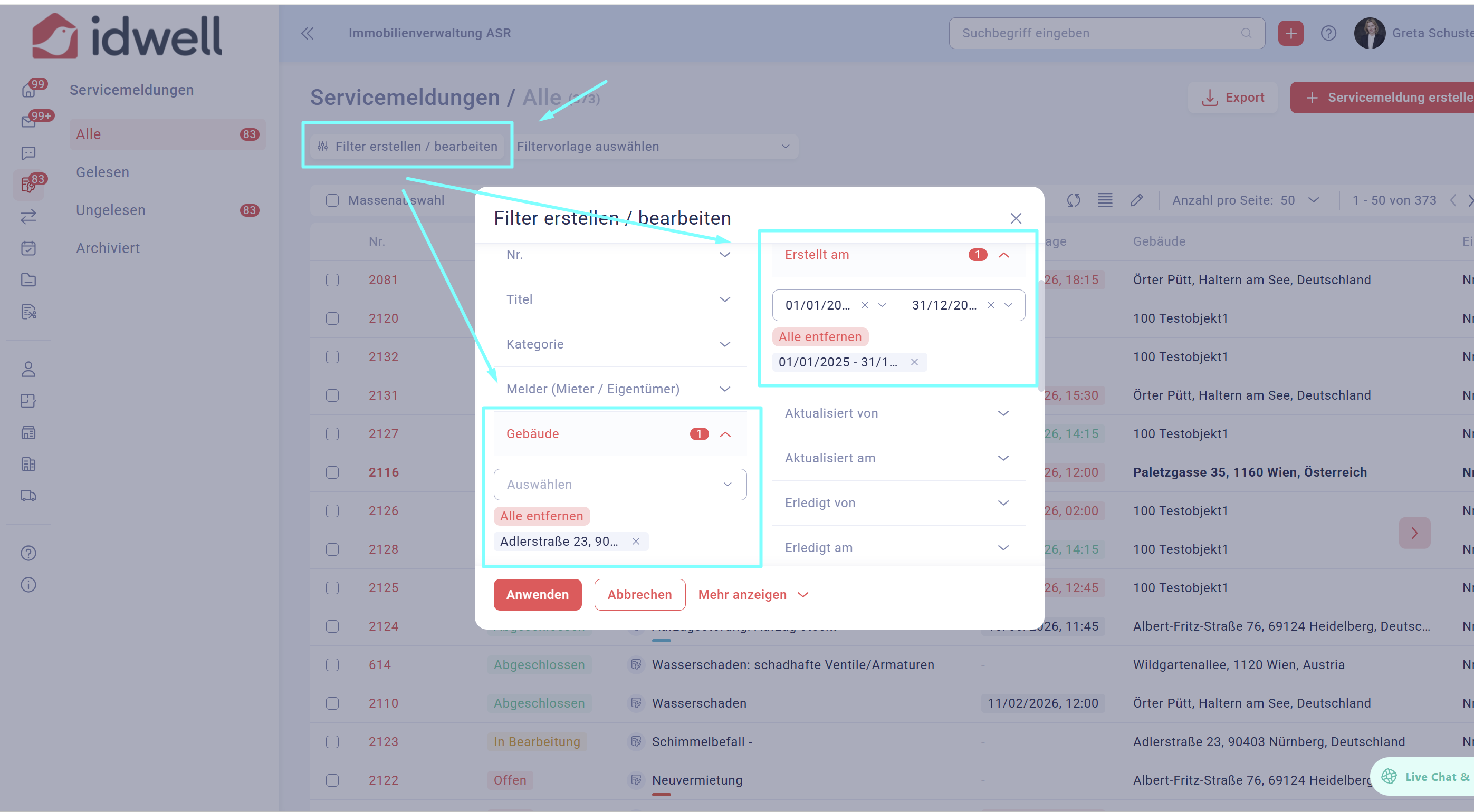 Filter setzen: Wählen Sie das gewünschte Gebäude oder einen Zeitraum aus.