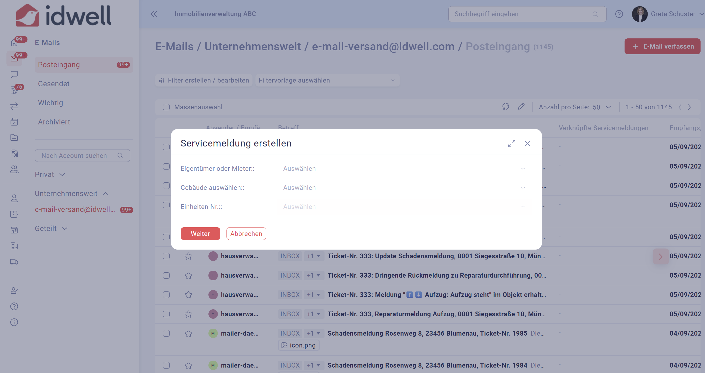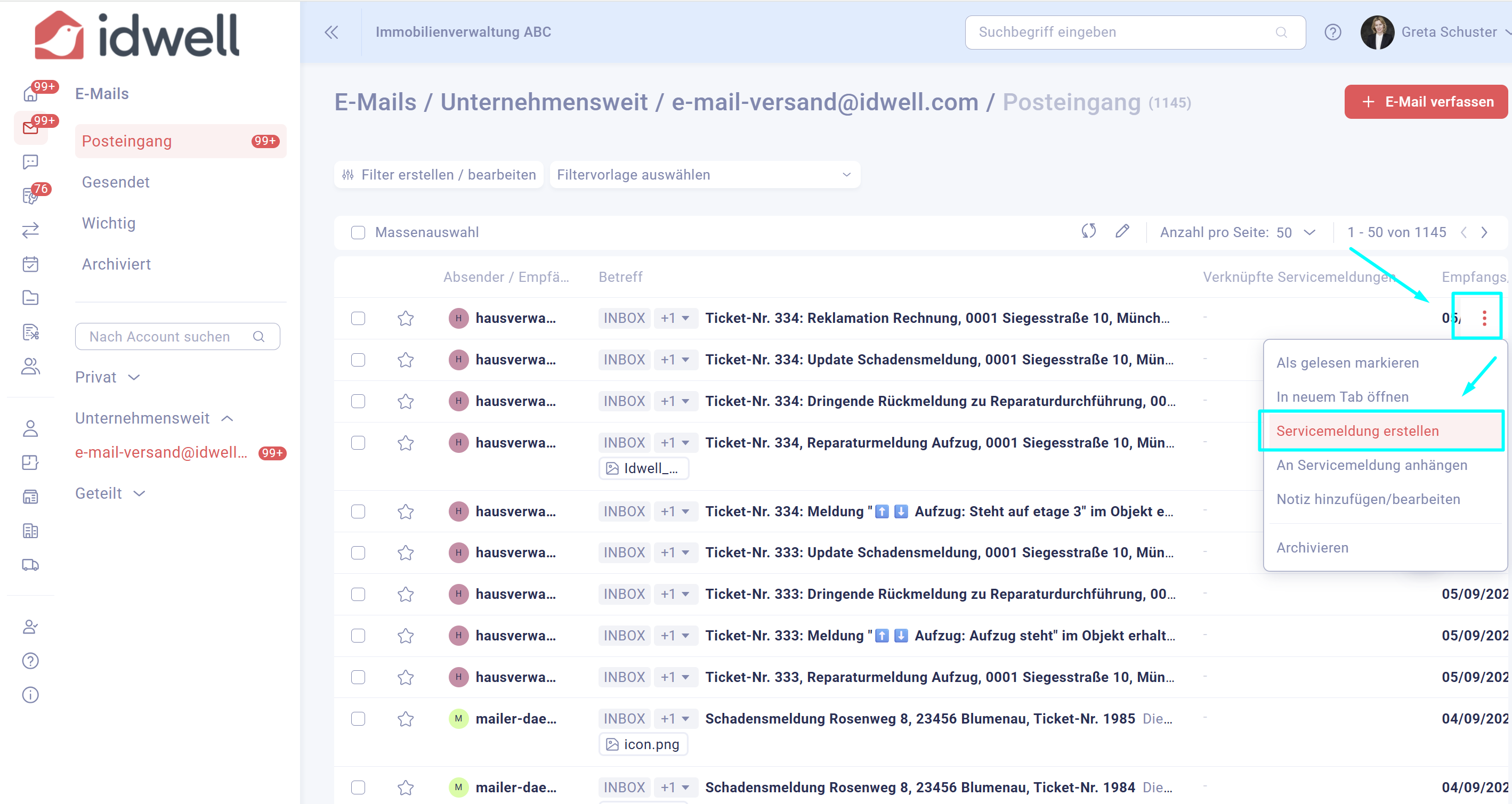 Um Zeit bei der Bearbeitung von Anfragen zu sparen, bietet iDWELL die Funktion, aus eingegangenen E-Mails direkt eine Servicemeldung zu erstellen. Um dies zu tun, gibt es zwei Möglichkeiten: