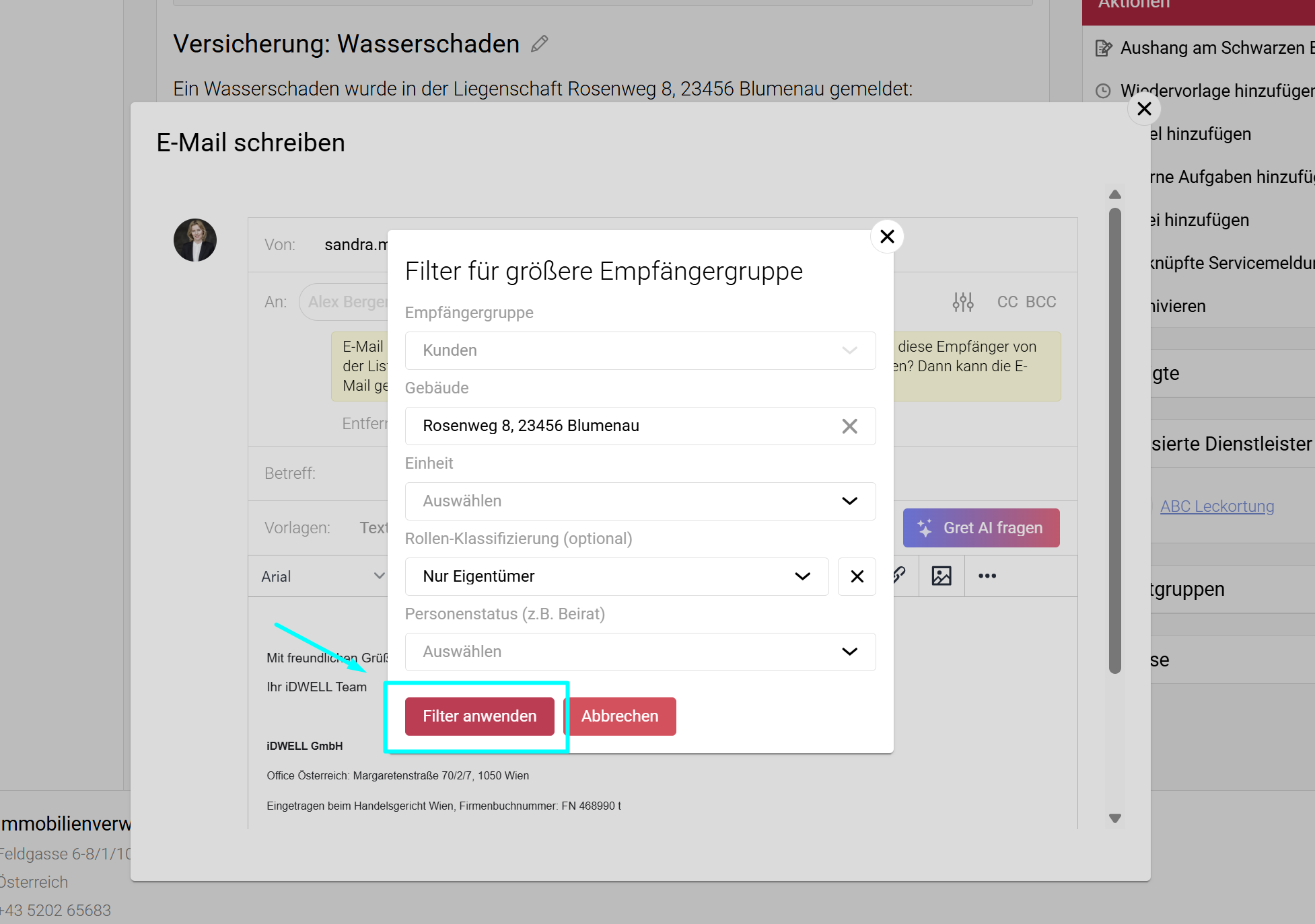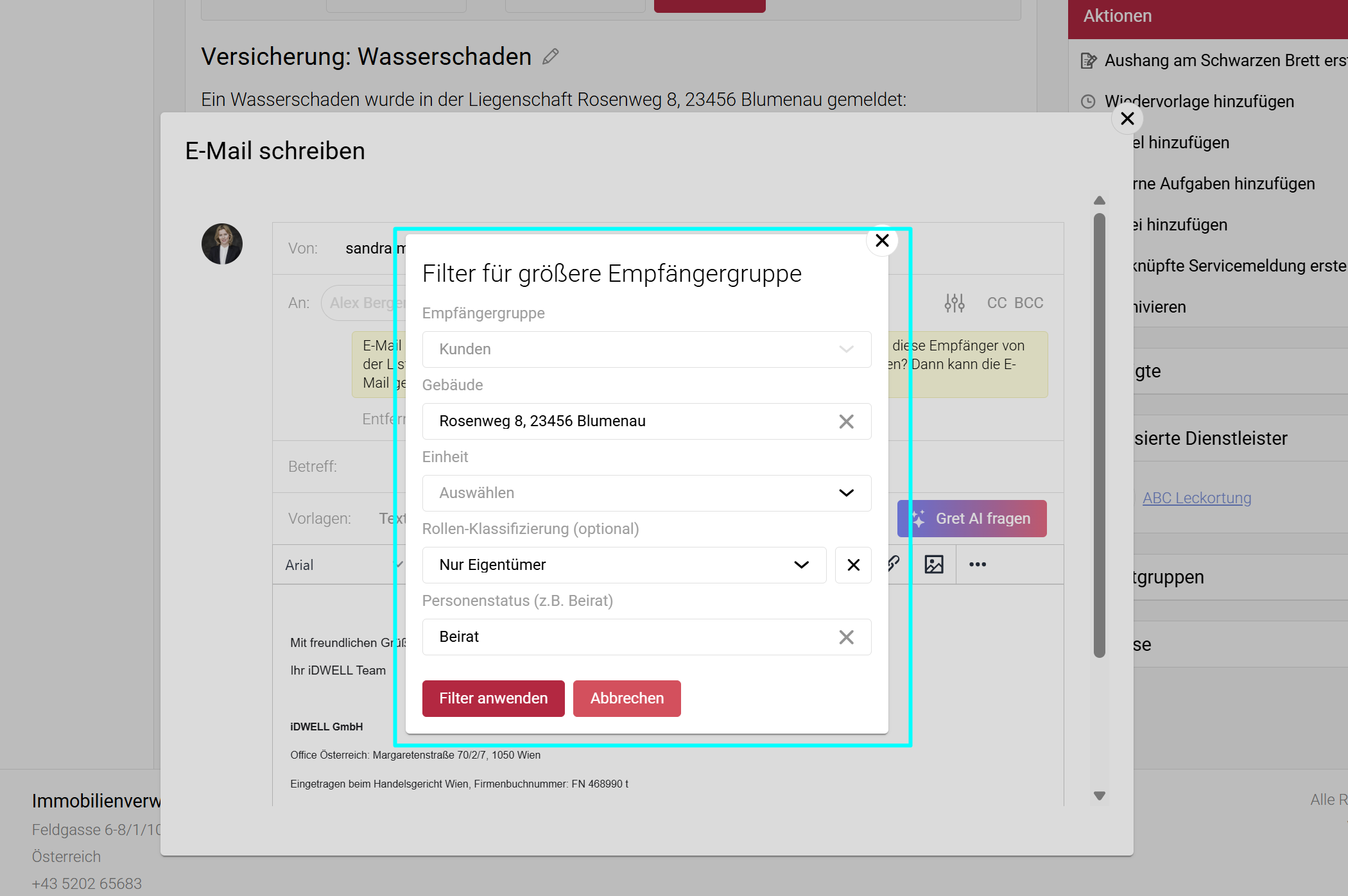 Mit einem Klick auf „Filter anwenden“ werden die Personen, die dem Filter entsprechen, als Empfänger der E-Mail hinzugefügt.