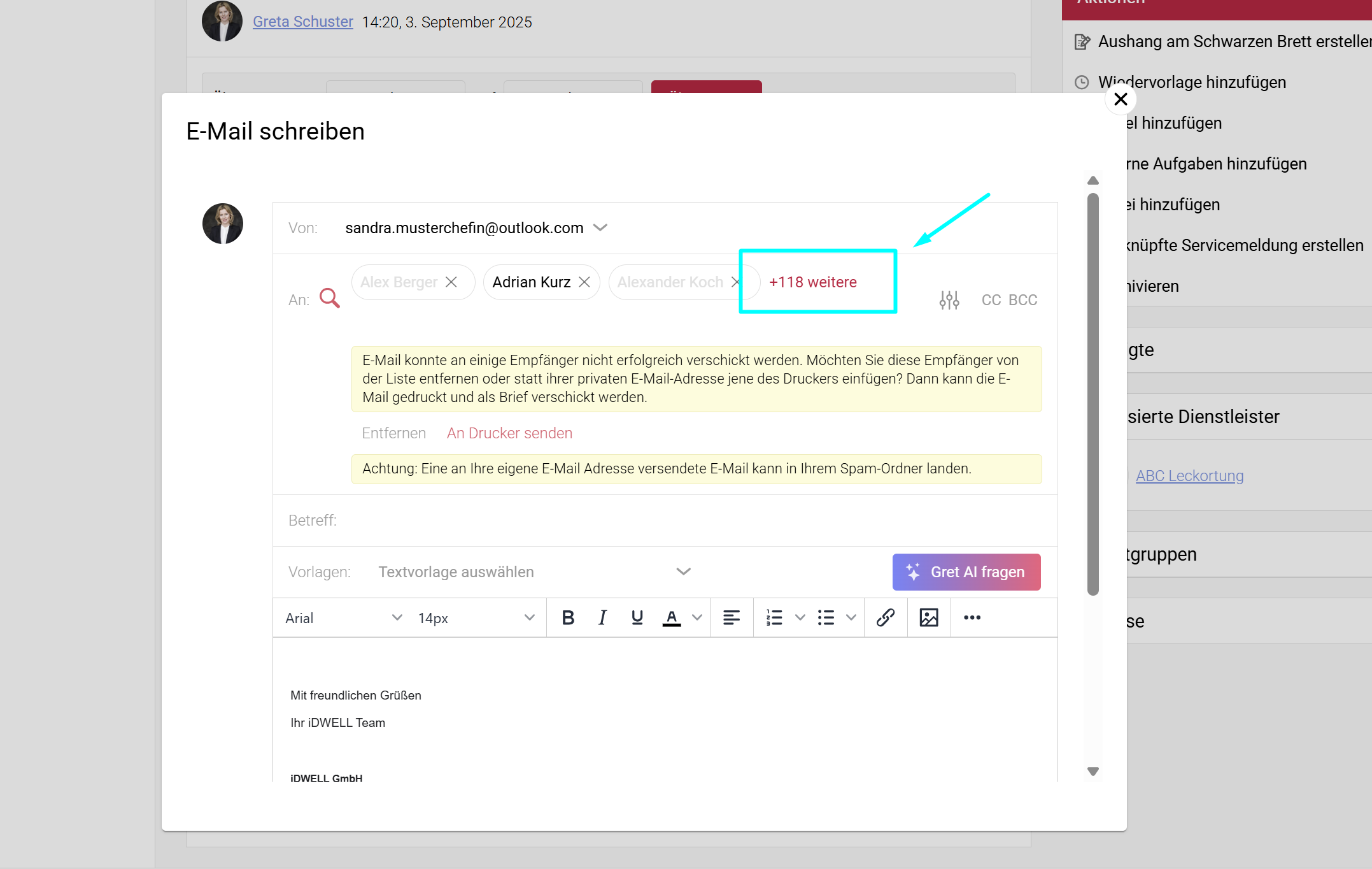 Als Absender sehen Sie Ihre E-Mail Adresse vermerkt. Sie können auch mehrere E-Mail Accounts mit dem System verknüpfen und entscheiden, in wessen Namen Sie die E-Mail versenden.