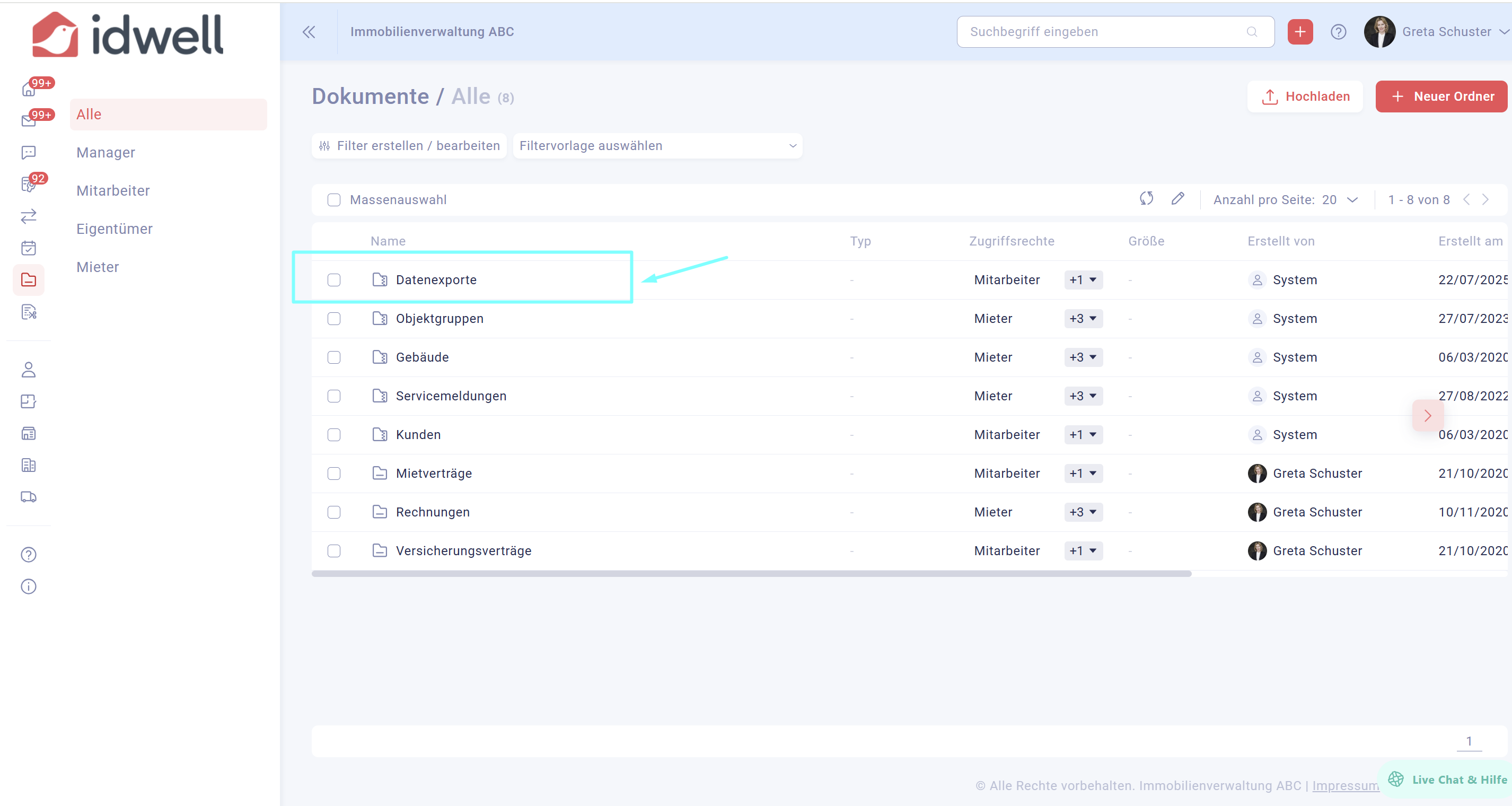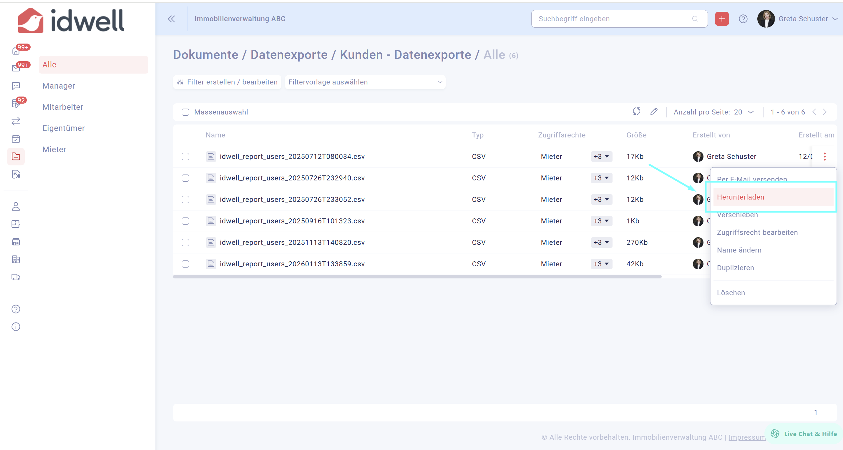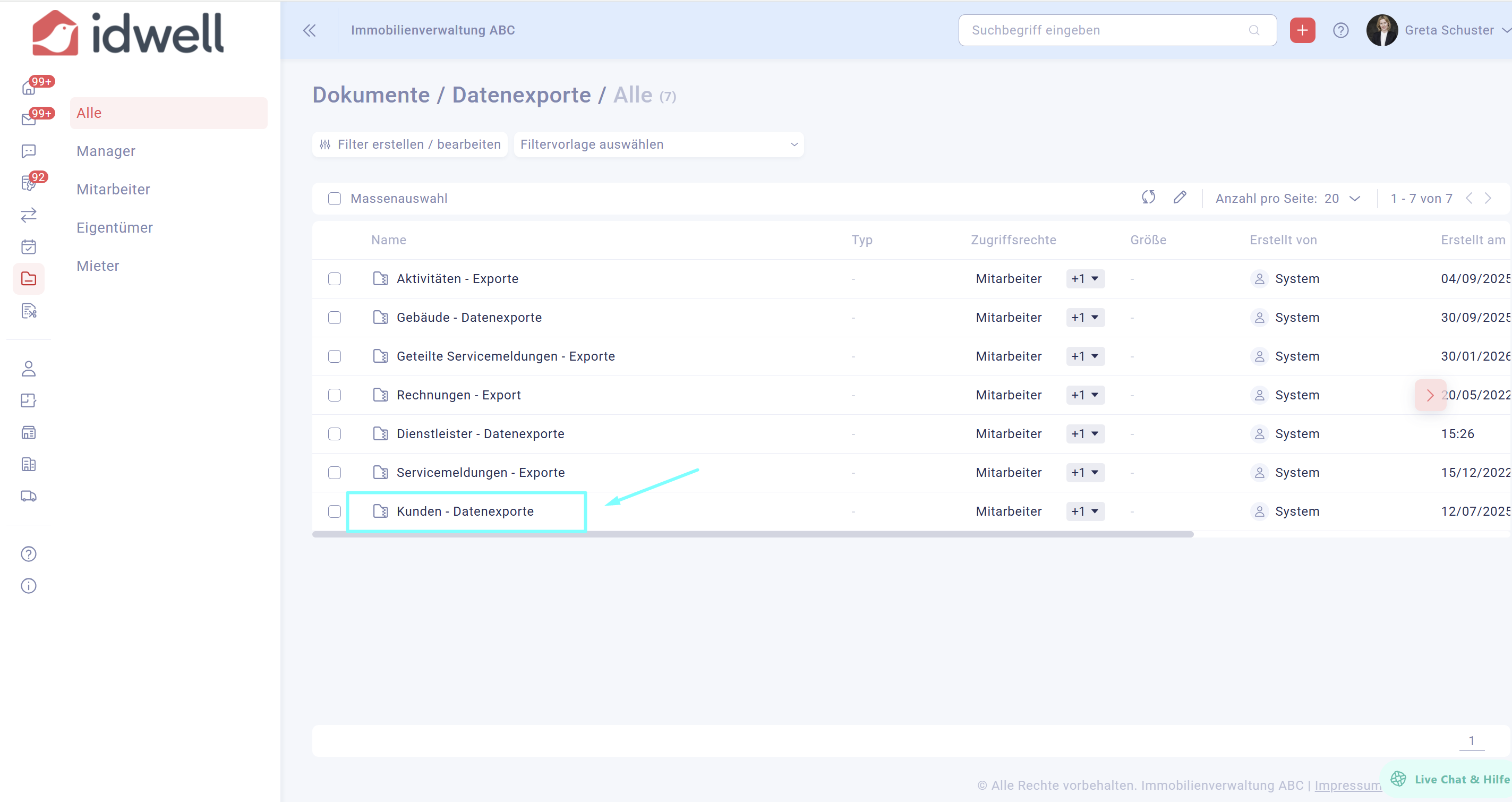 Wählen Sie nun den Ordner "Datenexporte" und dann "Kunden-Datenexporte" aus. Darin befindet sich nun die CSV-Datei, welche Sie herunterladen können (je nach der Datenvolumen kann es einige Minuten in Anspruch nehmen, bis die Datei generiert wurde).