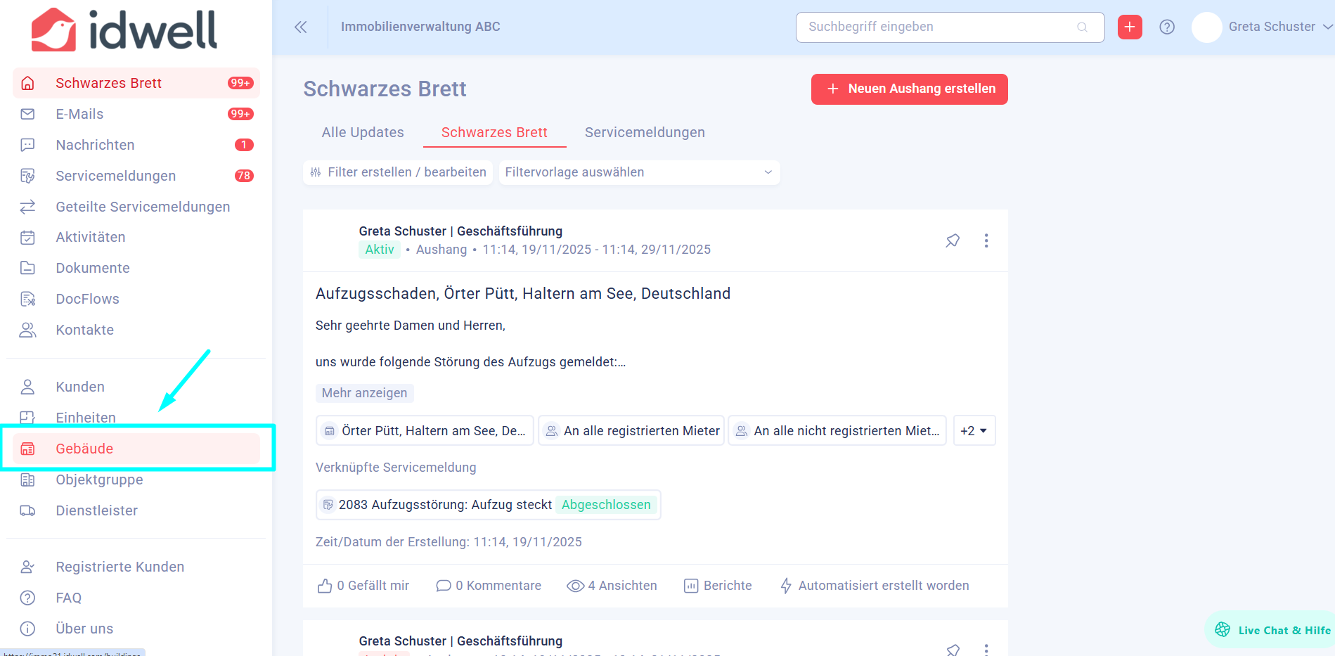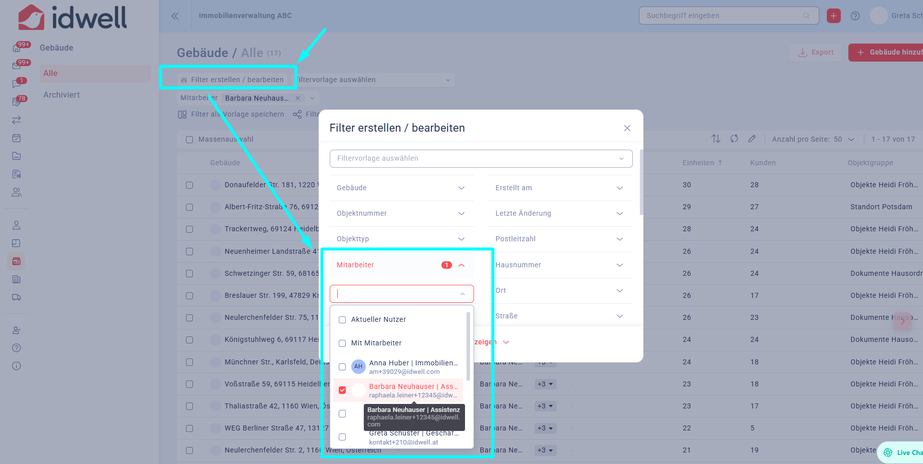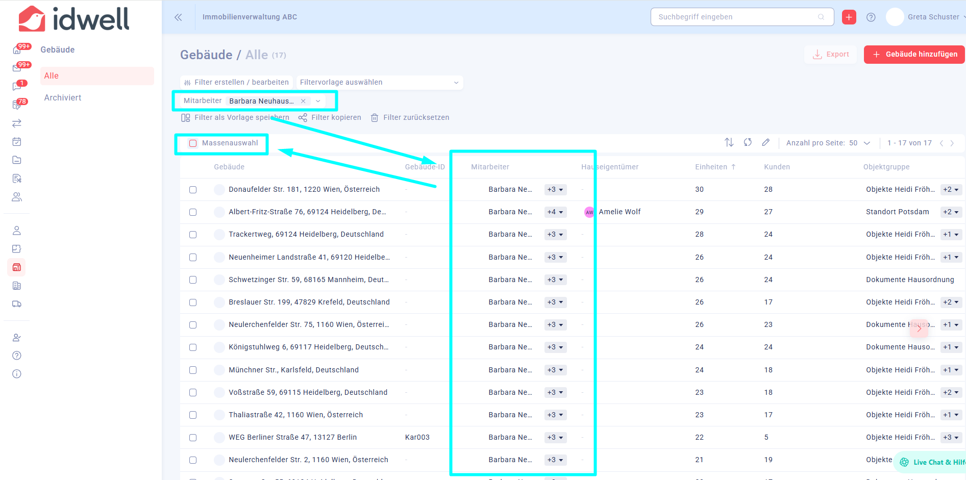 Selektieren Sie die Gebäude über "Filter erstellen/bearbeiten" nach einem bestimmten Parameter (zB über den zuständigen Mitarbeiter oder den Objekttyp für Miet- oder WEG-Verwaltung).