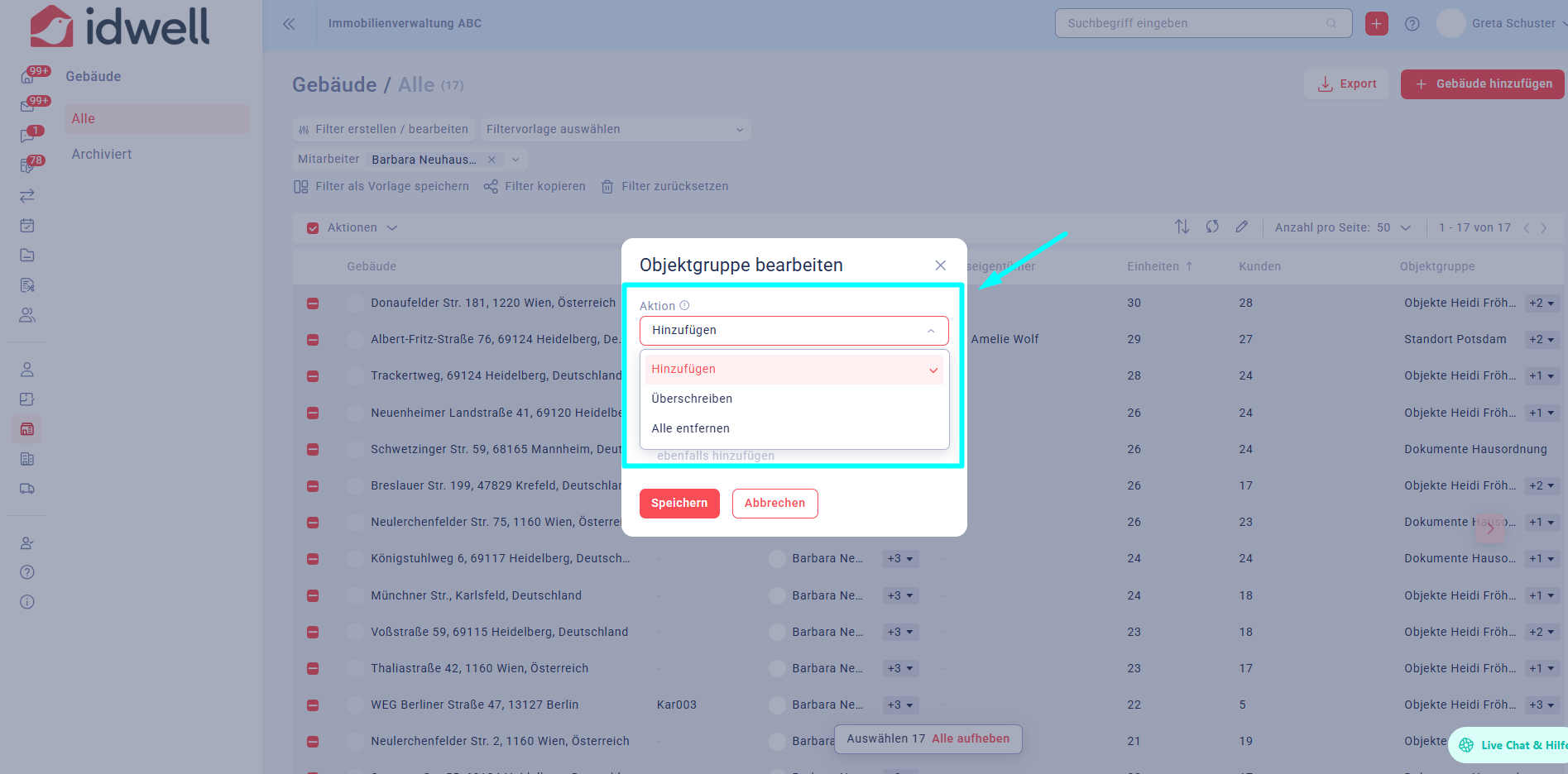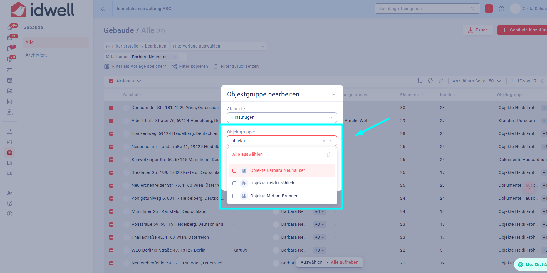 So können Sie zum Beispiel ganz einfach mit wenigen Klicks alle Gebäude einer bestimmten Mitarbeiterin zu einer Objektgruppe hinzufügen.