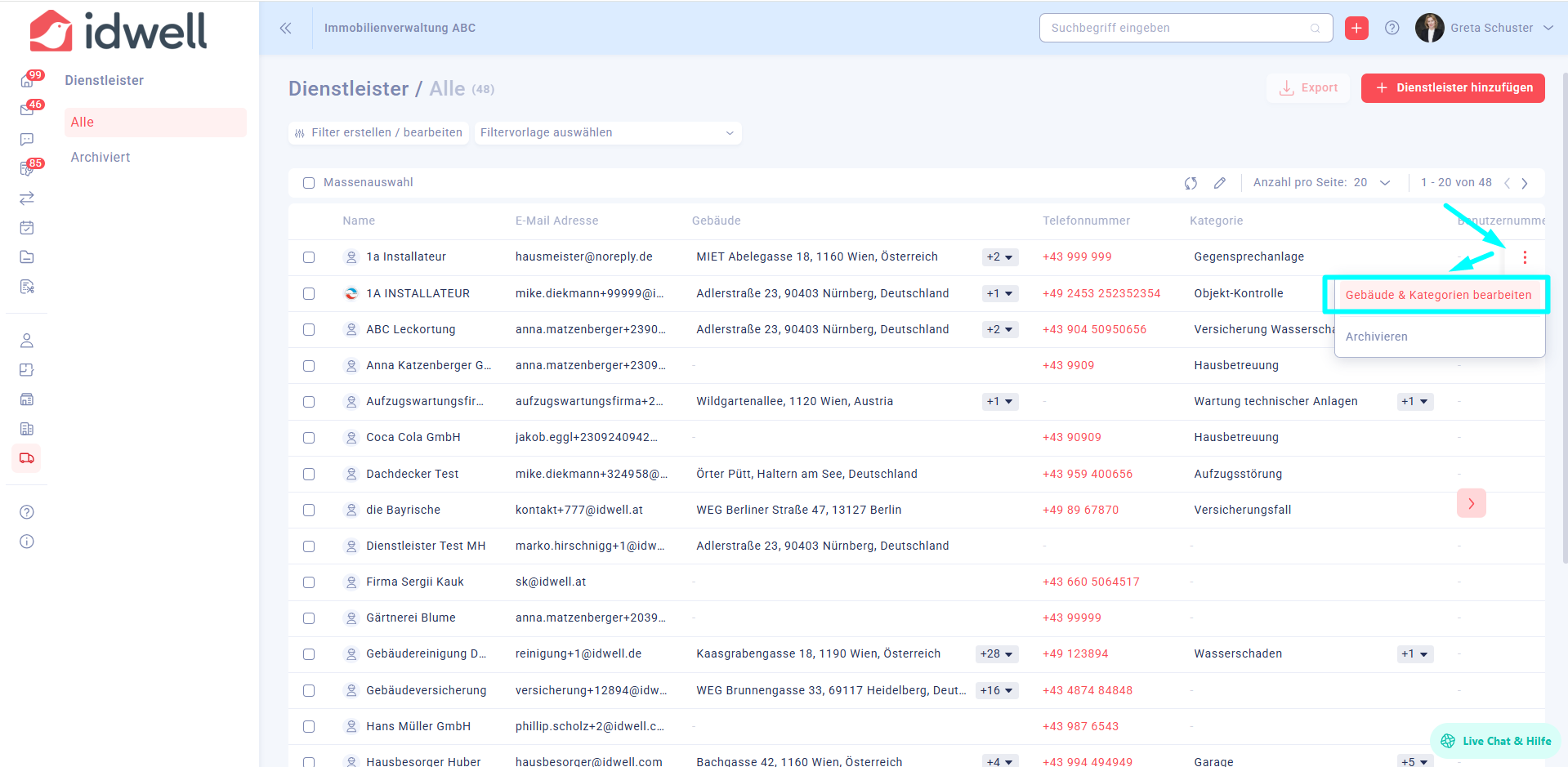 Suchen Sie nach dem Dienstleister Ihrer Wahl und fahren Sie mit der Maus über die Zeile, sodass rechts am Ende drei graue Punkte erscheinen. Klicken Sie die drei grauen Punkte an und wählen Sie “Gebäude & Kategorien bearbeiten” aus.