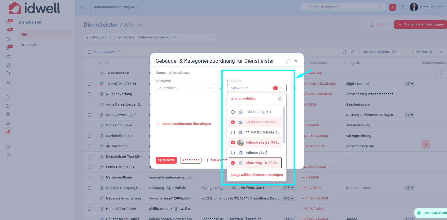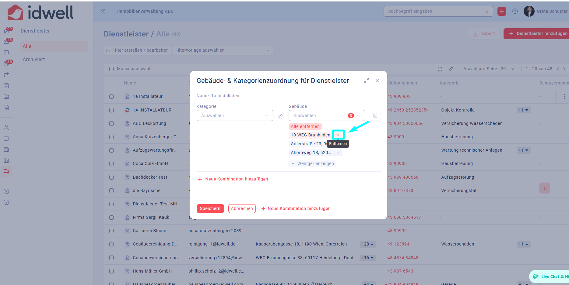 Gebäudezuordnung einzelner Dienstleister verwalten