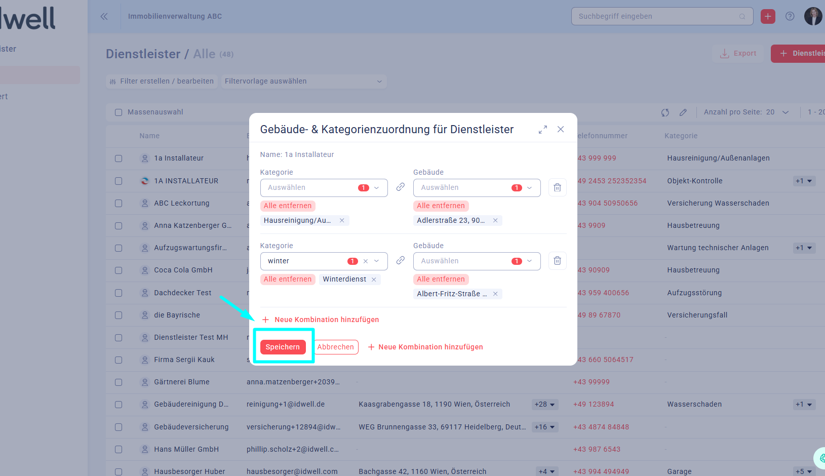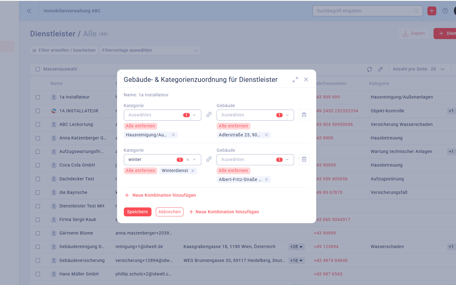 Wenn Sie einen Dienstleister haben, der z.B. den Winterdienst im Gebäude A, aber die Reinigung im Gebäude B macht, können Sie mehrere Kombinationen hinzufügen.