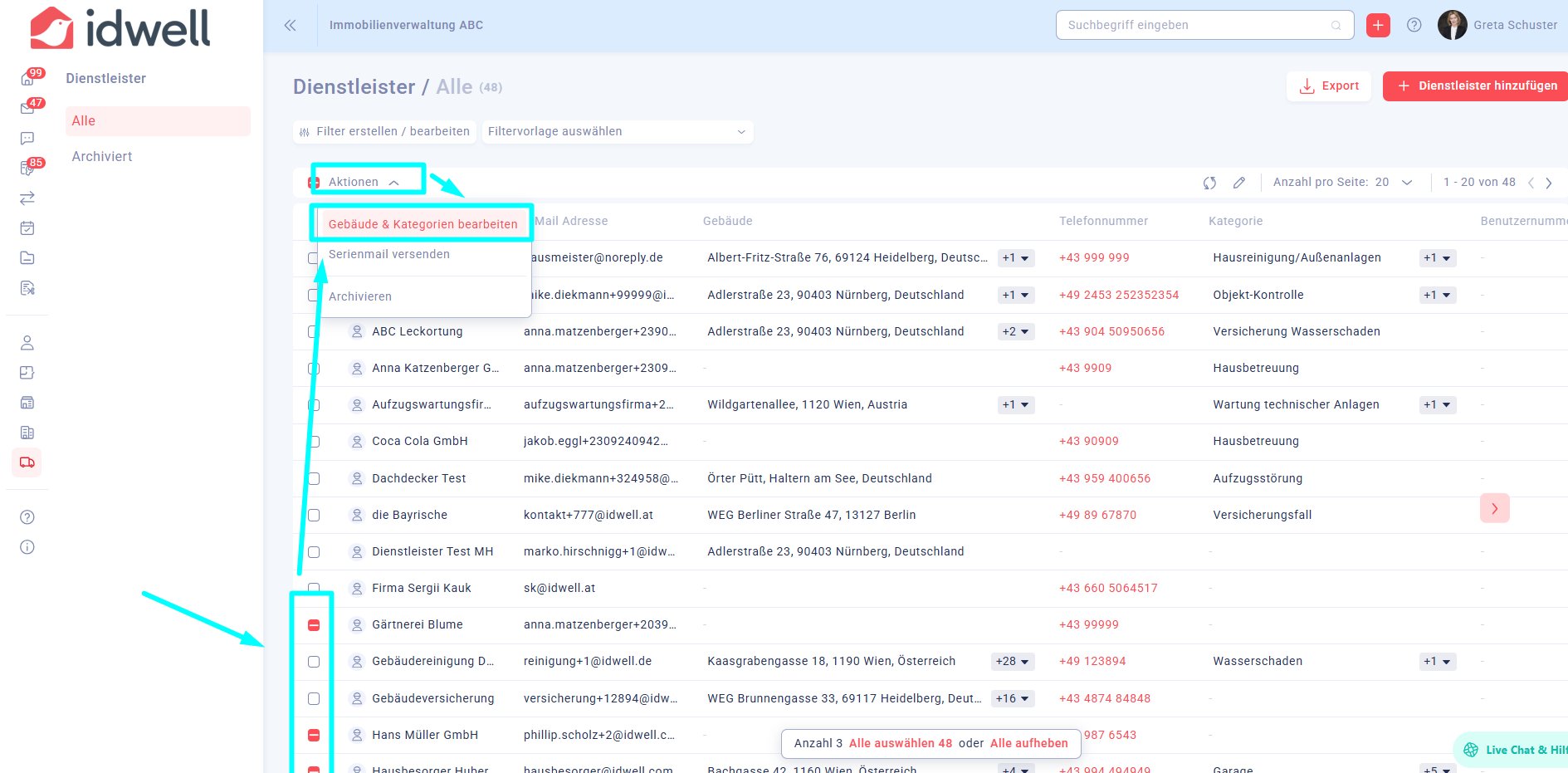 Markieren Sie all jene Dienstleister, die Sie demselben Gebäude zuweisen möchten. Der Button "Aktionen" erscheint. Wählen Sie nun "Gebäude zuweisen / bearbeiten" aus.
